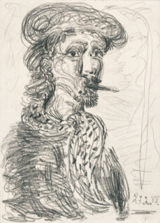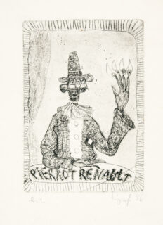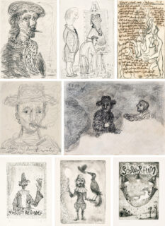 Enthält: 1. o.T. (Selbstbildnis mit Stift im Mund). Bleistift. 1988. 29,6 x 21 cm. Datiert (27.2.88.) - 2. Der Schornstein dampft mehr. Bleistift. 20 x 17 cm, unter Passepartout. Unter Glas gerahmt. - 3. Der Käufer prüft, ob der Maler wenigstens seinen Namen richtig schreibt. Bleistift. 1993. 29 x 20,5 cm. Datiert (17.3.93.) - 4. o.T. (Auf der Wolke). Bleistift. 1993. 18,4 x 25 cm, unter Passepartout. Unter Glas gerahmt. Datiert (9.7.93.) - 5. Bürger, schont eure Anlagen (Erich Kästner). Braune und schwarze Kreide. 69 x 42,3 cm. - Beigegeben: Derselbe. Pierrot Renault - Zirkus - Prinz Boris steht Modell - Solarium. Vier Blatt Radierungen auf Büttenkarton. 1986-2001. Von 14,7 x 10,2 (27 x 20) bis 24,8 x 28 (50 x 37,5) cm. Jeweils signiert, drei Blatt datiert.