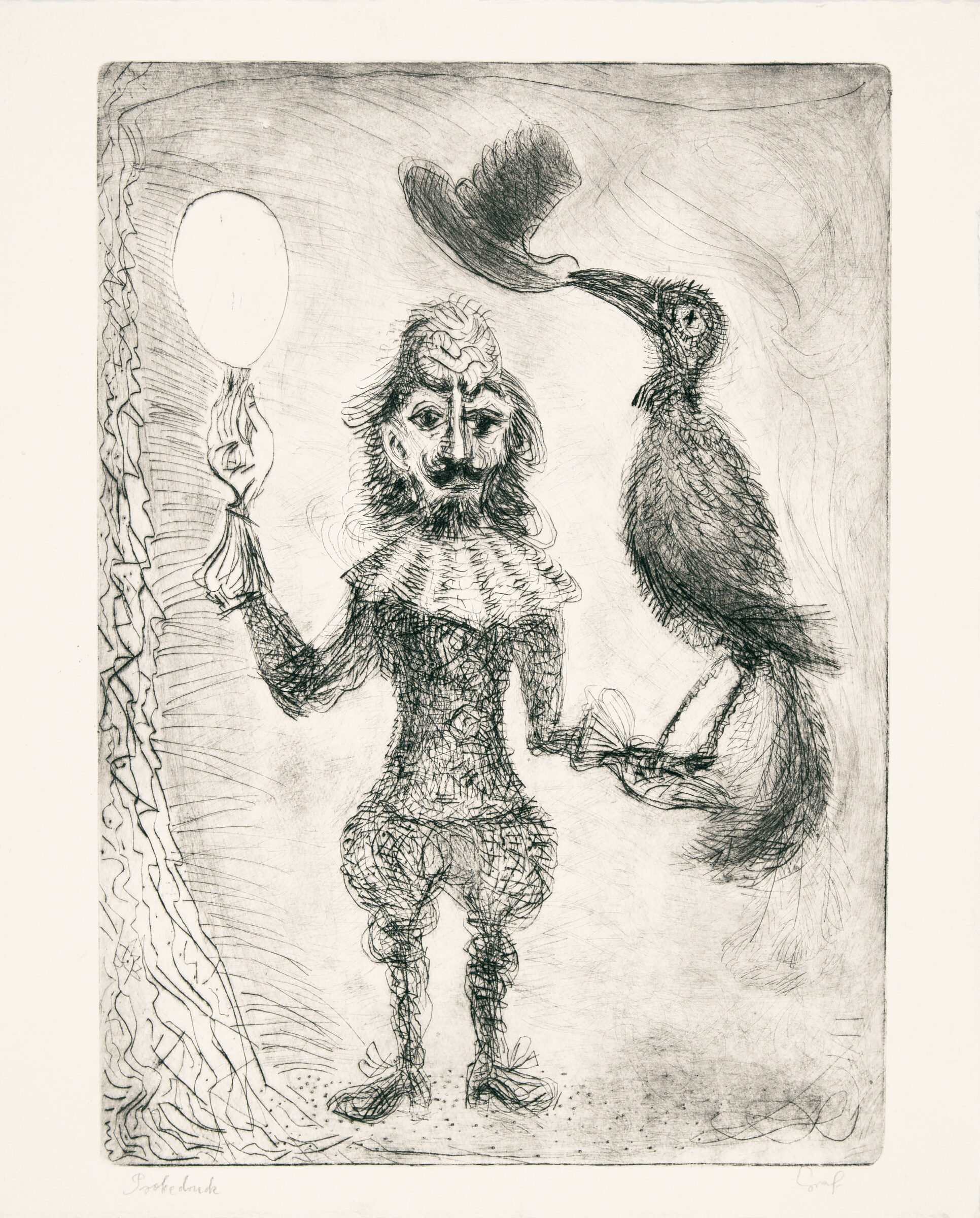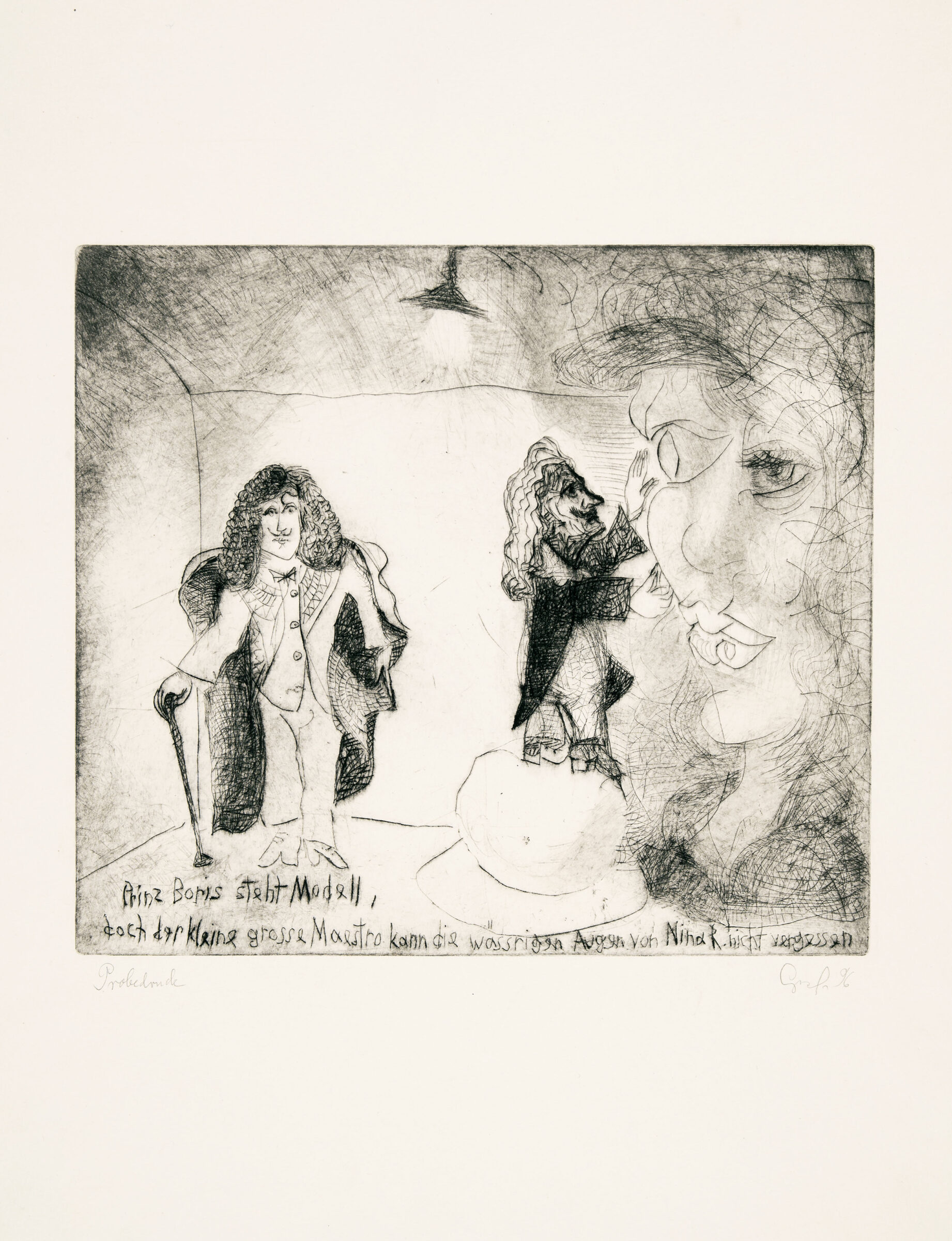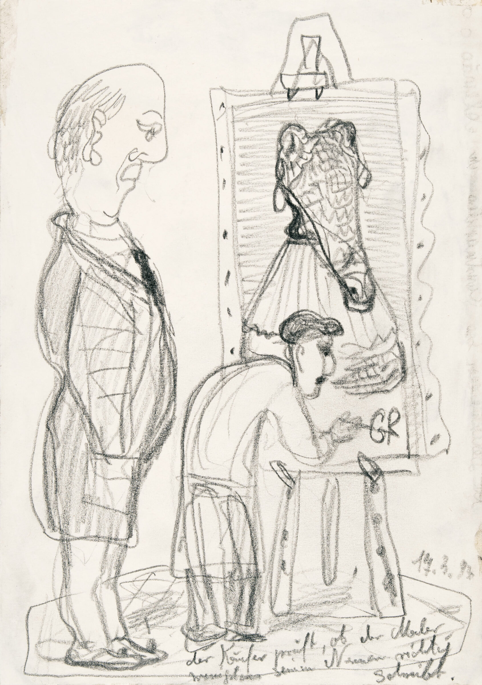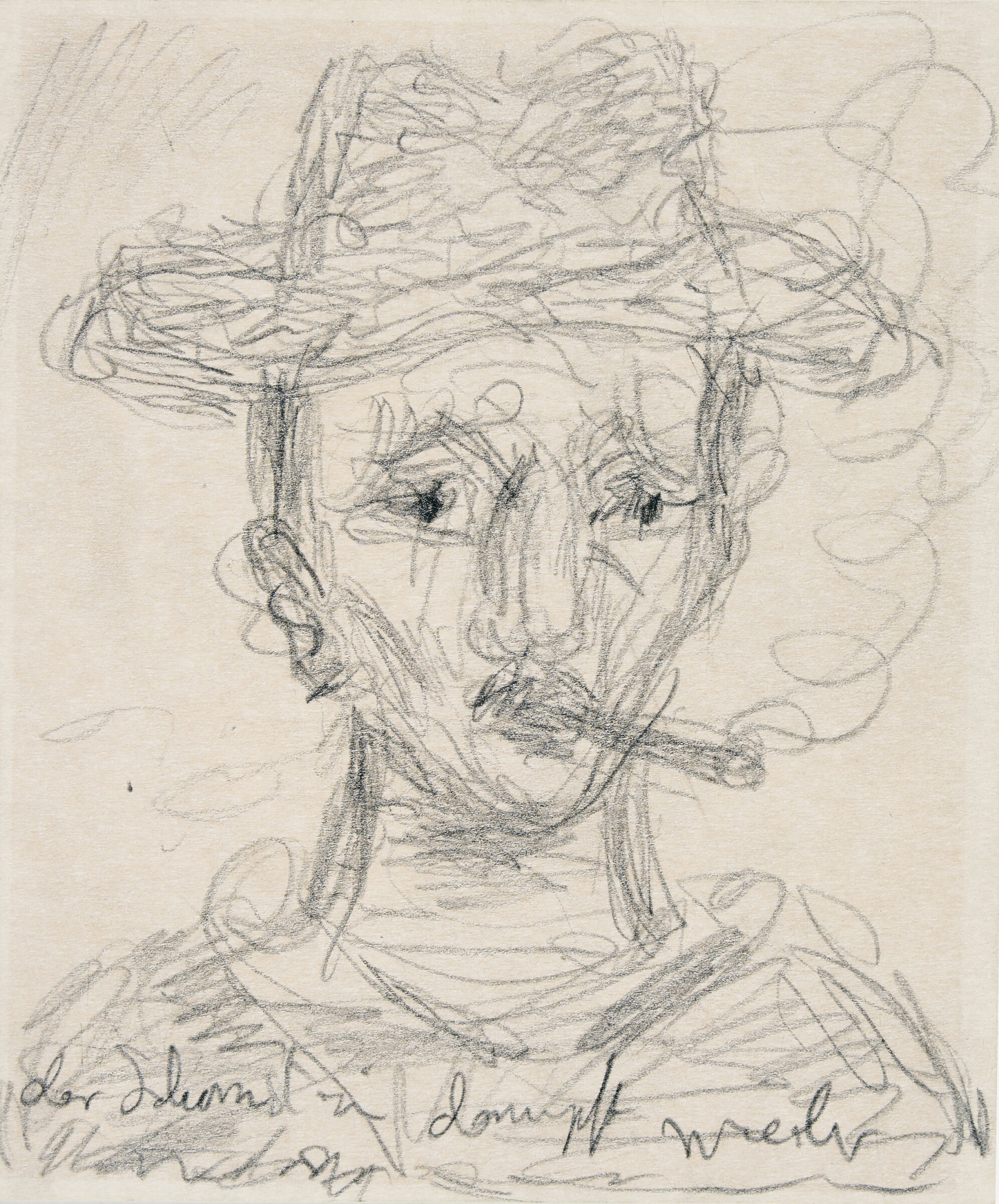 Enthält: 1. o.T. (Selbstbildnis mit Stift im Mund). Bleistift. 1988. 29,6 x 21 cm. Datiert (27.2.88.) - 2. Der Schornstein dampft mehr. Bleistift. 20 x 17 cm, unter Passepartout. Unter Glas gerahmt. - 3. Der Käufer prüft, ob der Maler wenigstens seinen Namen richtig schreibt. Bleistift. 1993. 29 x 20,5 cm. Datiert (17.3.93.) - 4. o.T. (Auf der Wolke). Bleistift. 1993. 18,4 x 25 cm, unter Passepartout. Unter Glas gerahmt. Datiert (9.7.93.) - 5. Bürger, schont eure Anlagen (Erich Kästner). Braune und schwarze Kreide. 69 x 42,3 cm. - Beigegeben: Derselbe. Pierrot Renault - Zirkus - Prinz Boris steht Modell - Solarium. Vier Blatt Radierungen auf Büttenkarton. 1986-2001. Von 14,7 x 10,2 (27 x 20) bis 24,8 x 28 (50 x 37,5) cm. Jeweils signiert, drei Blatt datiert.