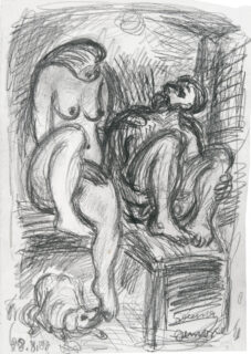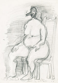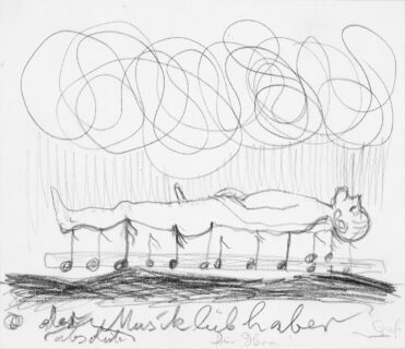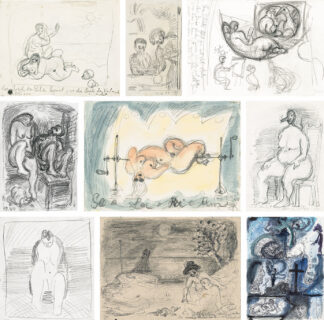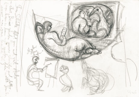Enthält: 1. Sauna amoré. Bleistift. 1986. 25 x 18 cm, unter Passepartout. Unter Glas gerahmt. - 2. o.T. (Sitzender Akt). Bleistift. Um 1987. 23,2 x 21 cm. - 3. o.T. (Im Cafe). Bleistift. 1988. 29 x 18 cm, unter Passepartout. Unter Glas gerahmt. Datiert (4.12.88.) - 4. o.T. (Schwein). Aquarell und Tusche über Kugelschreiber auf kariertem Papier. 1996. 29,5 x 21 cm. - 5. Was ist Schönheit - schwer zu erklären... Bleistift. 1998. 29,7 x 21 cm. - 6. So La Ri Um (Akt am Spieß). Aquarell und Bleistift. 2000. 21 x 29,7 cm. Datiert (14.9.00.) - 7. Die Logik des Bildes beginnt, wo die Logik des Verstandes endet. Bleistift auf Papier. 2000. 23,5 x 29 cm. - 8. 2 Helden erwarten den Feind. Kugelschreiber und Bleistift. 19,7 x 26,5 cm. - 9. Frau Schnike fährt gern und viel Auto - ihre Beine werden immer schwächer und fetter. Bleistift. 21 x 29,7 cm. - Beigegeben: Derselbe. Der absolute Musikliebhaber. Bleistift auf Karton. 15,4 x 17,7 cm. Signiert, betitelt und mit Widmung versehen. Verso bezeichnet.