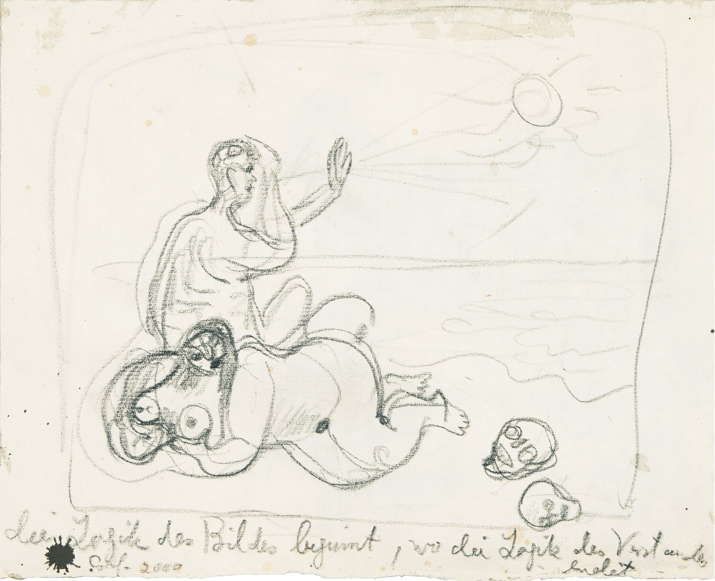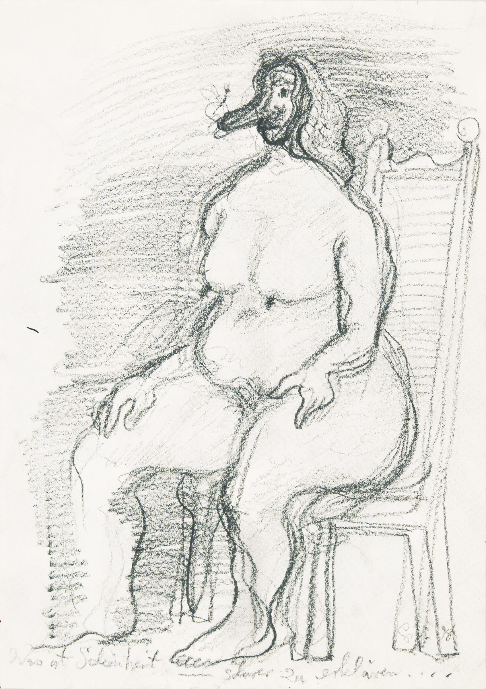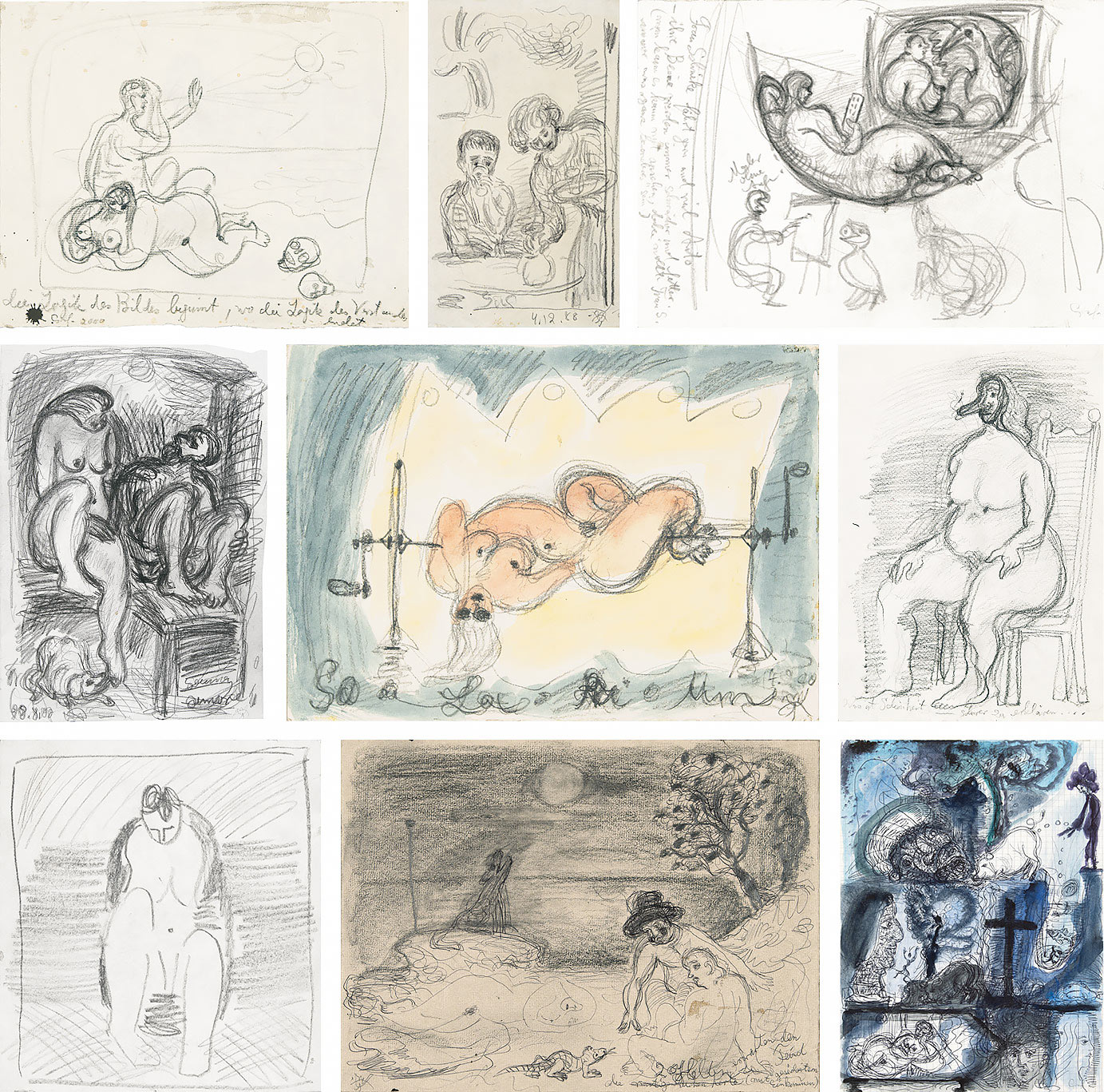 Enthält: 1. Sauna amoré. Bleistift. 1986. 25 x 18 cm, unter Passepartout. Unter Glas gerahmt. - 2. o.T. (Sitzender Akt). Bleistift. Um 1987. 23,2 x 21 cm. - 3. o.T. (Im Cafe). Bleistift. 1988. 29 x 18 cm, unter Passepartout. Unter Glas gerahmt. Datiert (4.12.88.) - 4. o.T. (Schwein). Aquarell und Tusche über Kugelschreiber auf kariertem Papier. 1996. 29,5 x 21 cm. - 5. Was ist Schönheit - schwer zu erklären... Bleistift. 1998. 29,7 x 21 cm. - 6. So La Ri Um (Akt am Spieß). Aquarell und Bleistift. 2000. 21 x 29,7 cm. Datiert (14.9.00.) - 7. Die Logik des Bildes beginnt, wo die Logik des Verstandes endet. Bleistift auf Papier. 2000. 23,5 x 29 cm. - 8. 2 Helden erwarten den Feind. Kugelschreiber und Bleistift. 19,7 x 26,5 cm. - 9. Frau Schnike fährt gern und viel Auto - ihre Beine werden immer schwächer und fetter. Bleistift. 21 x 29,7 cm. - Beigegeben: Derselbe. Der absolute Musikliebhaber. Bleistift auf Karton. 15,4 x 17,7 cm. Signiert, betitelt und mit Widmung versehen. Verso bezeichnet.