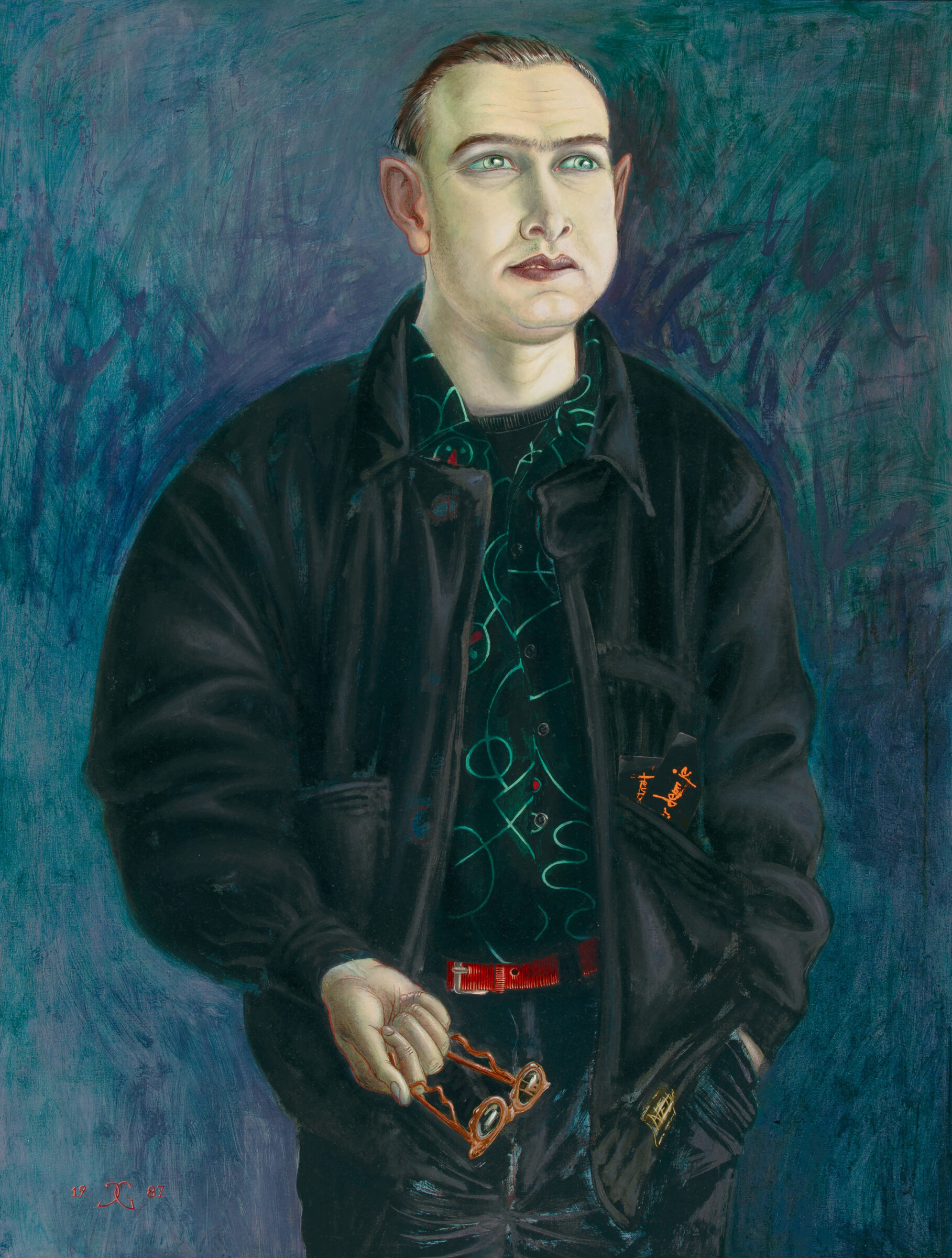 Gröszer/Sperling 100 - Bei dem Dargestellten handelt es sich vermutlich um den Kurator und Autor Christoph Tannert. - "Die ganze Palette gesellschaftlichen Seins ist authentisch, visuelle Sensation permanent - Glimmer, Glanz und Trivialität allgegenwärtig. Daran entzünde ich meine Kunst." (Gröszer, zitiert nach: Kunst in der DDR. Berlin, Neue Nationalgalerie, 2003, S. 306) - Clemens Gröszers extravagante Gestalten und Figuren sind abschreckend und faszinierend zugleich. Detailliert bis in die letzte Faser beschreibt er die Körper seiner Protagonisten und sucht "bewusst die überzogene Versenkung in einen detailreichen Naturalismus" (Fritz Jacobi, Großstadt veristisch, in: ebd., S. 228).