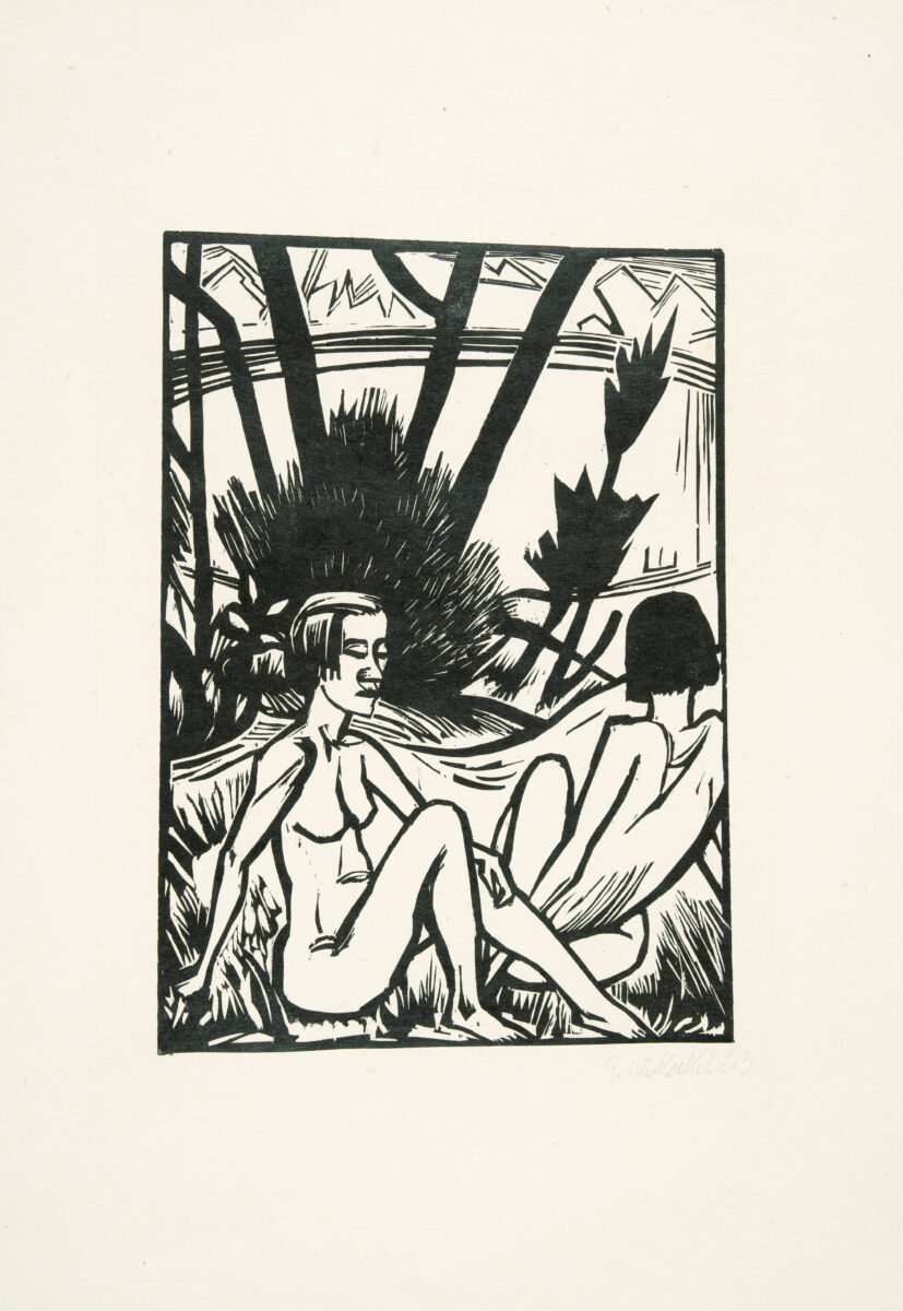 Zwei Sitzende. Holzschnitt auf chamoisfarbenem Bütten. 1923. 40 x 29 (70 x 55,5) cm. Unter Glas gerahmt.