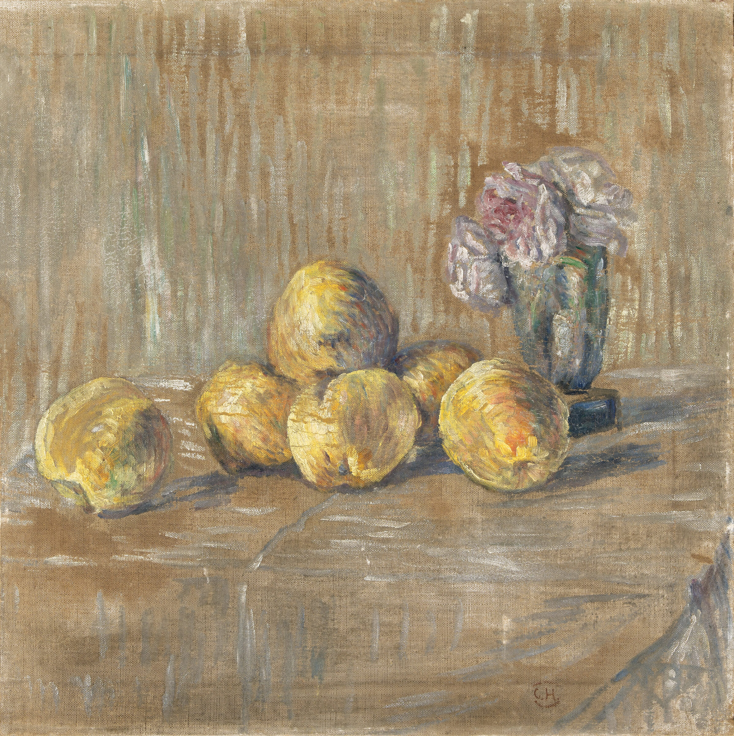 Stilleben mit Äpfeln und Vase. Öl auf Leinwand auf Holz. Um 1905. 50 x 50 cm. Gerahmt.
