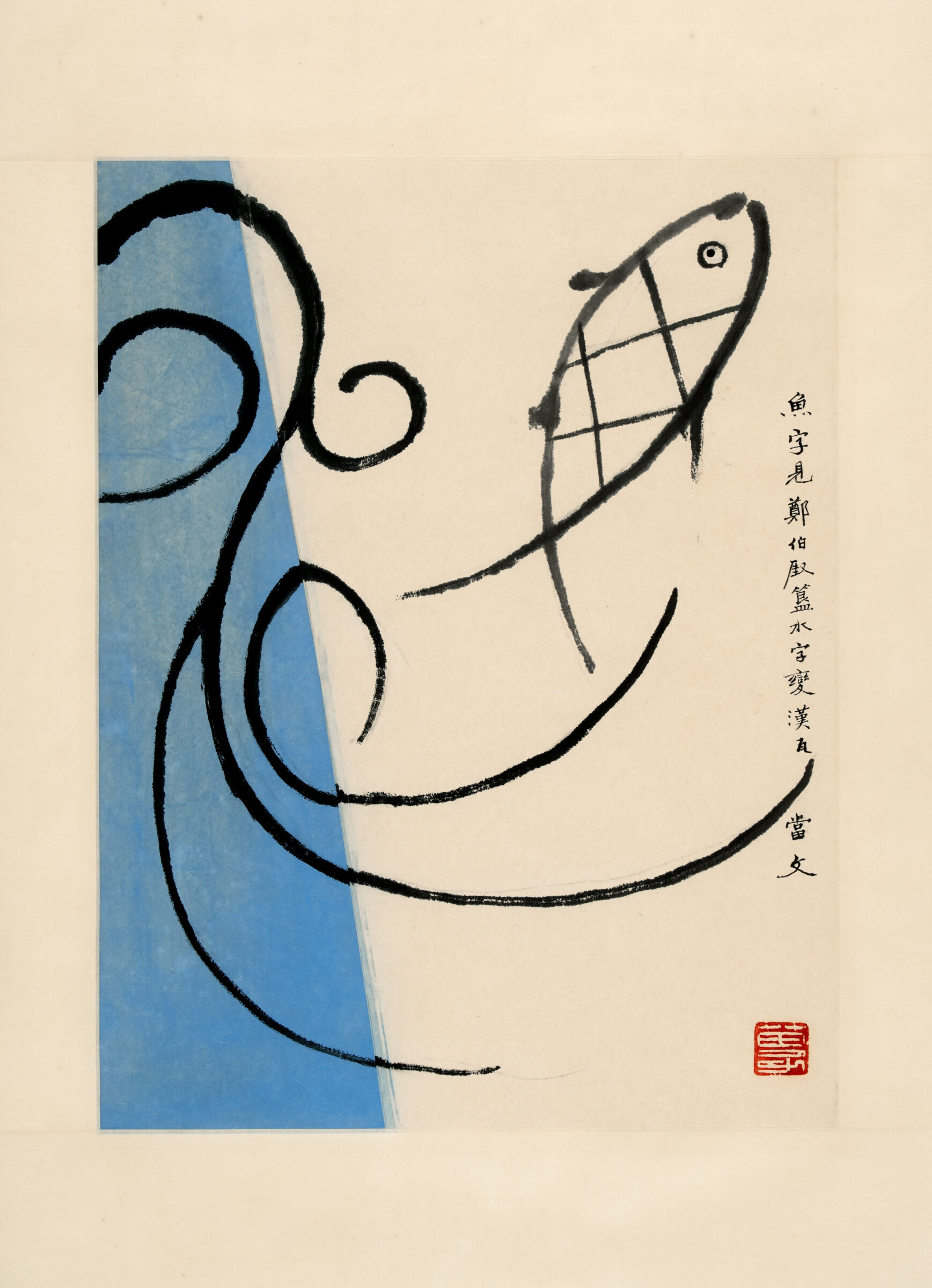 Fisch mit Wasser. Pinsel in Tusche u. Gouache über Kreide auf zwei Lagen feinem Japan, mit Seide auf Karton montiert. 1992. 65 x 49,4 (89,5 x 64) cm. Unter Glas gerahmt.