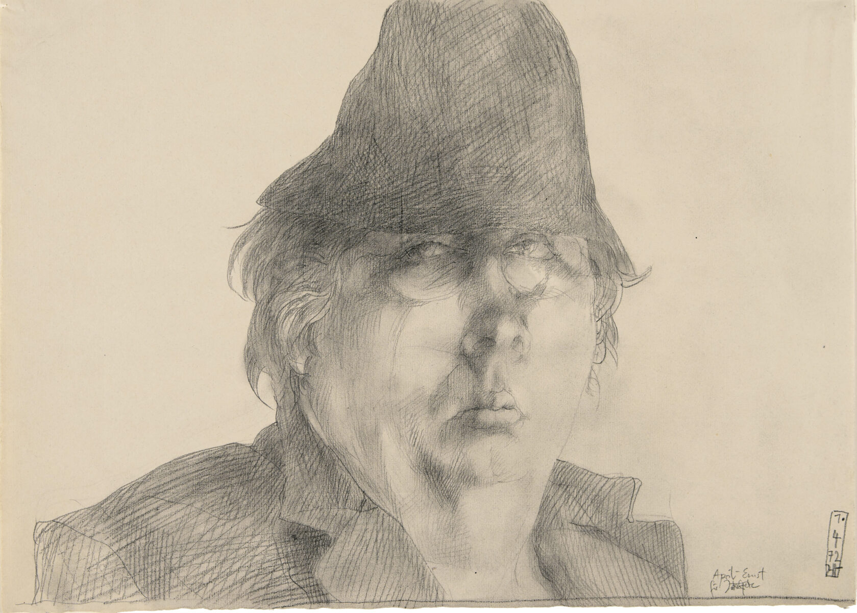 April-Ernst. Bleistift auf Bütten. 1972. 33,5 x 46,5 cm, im Passepartout freigestellt.