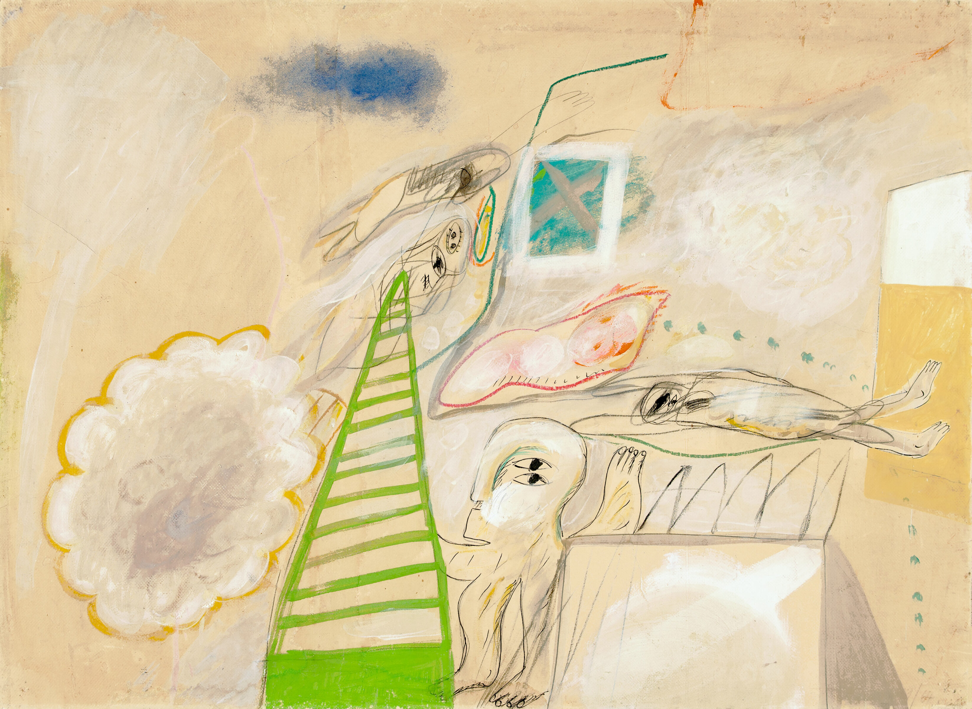 Figur mit Landschaft. Tempera u. Mischtechnik auf chamoisfarbenem Karton auf grober Leinwand. 1961/64. 78 x 107 cm. Gerahmt.