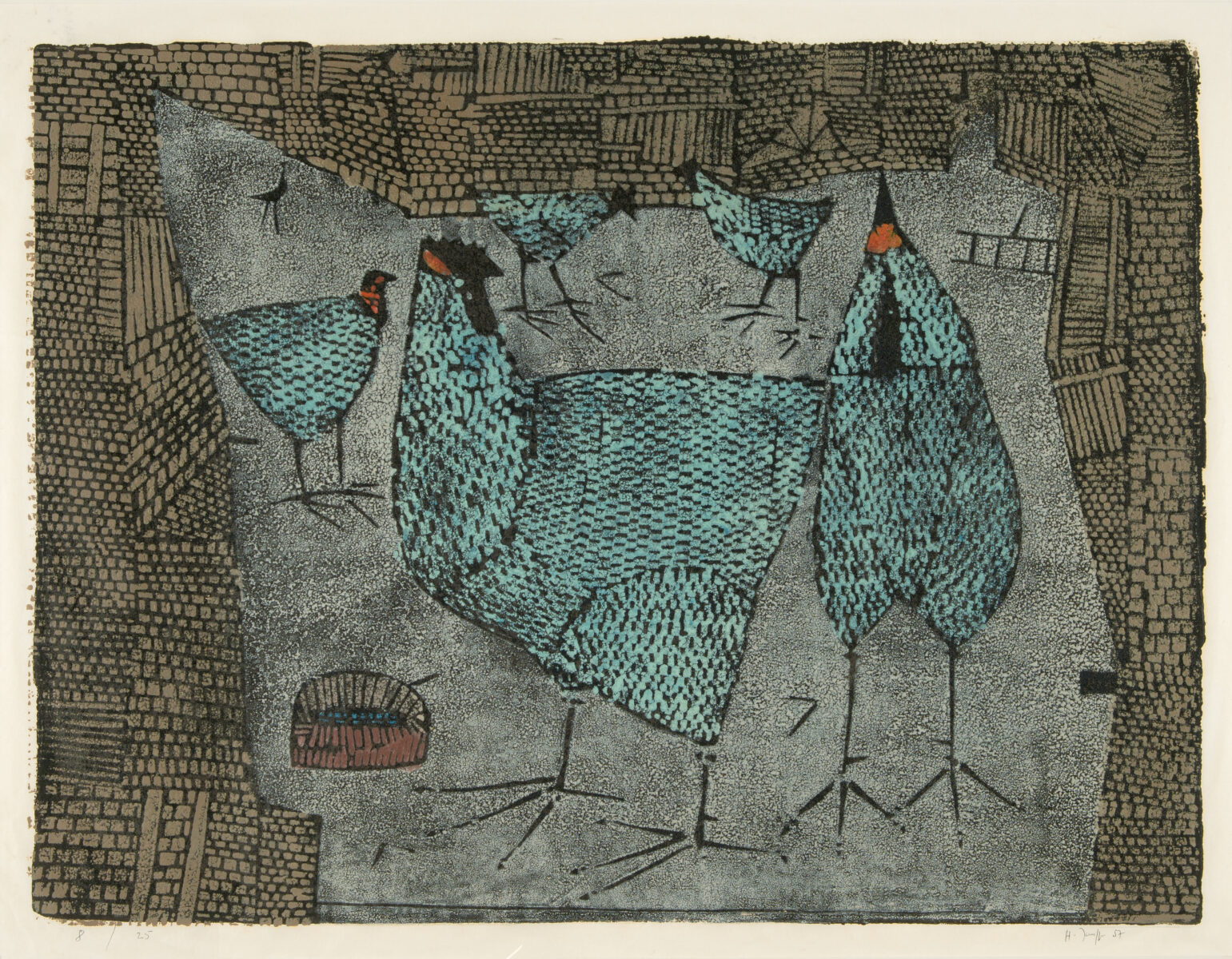 Hühner. Farbholzschnitt auf Japan. 1957. 47,5 x 63,5 (62 x 93,2) cm, unter Passepartout.