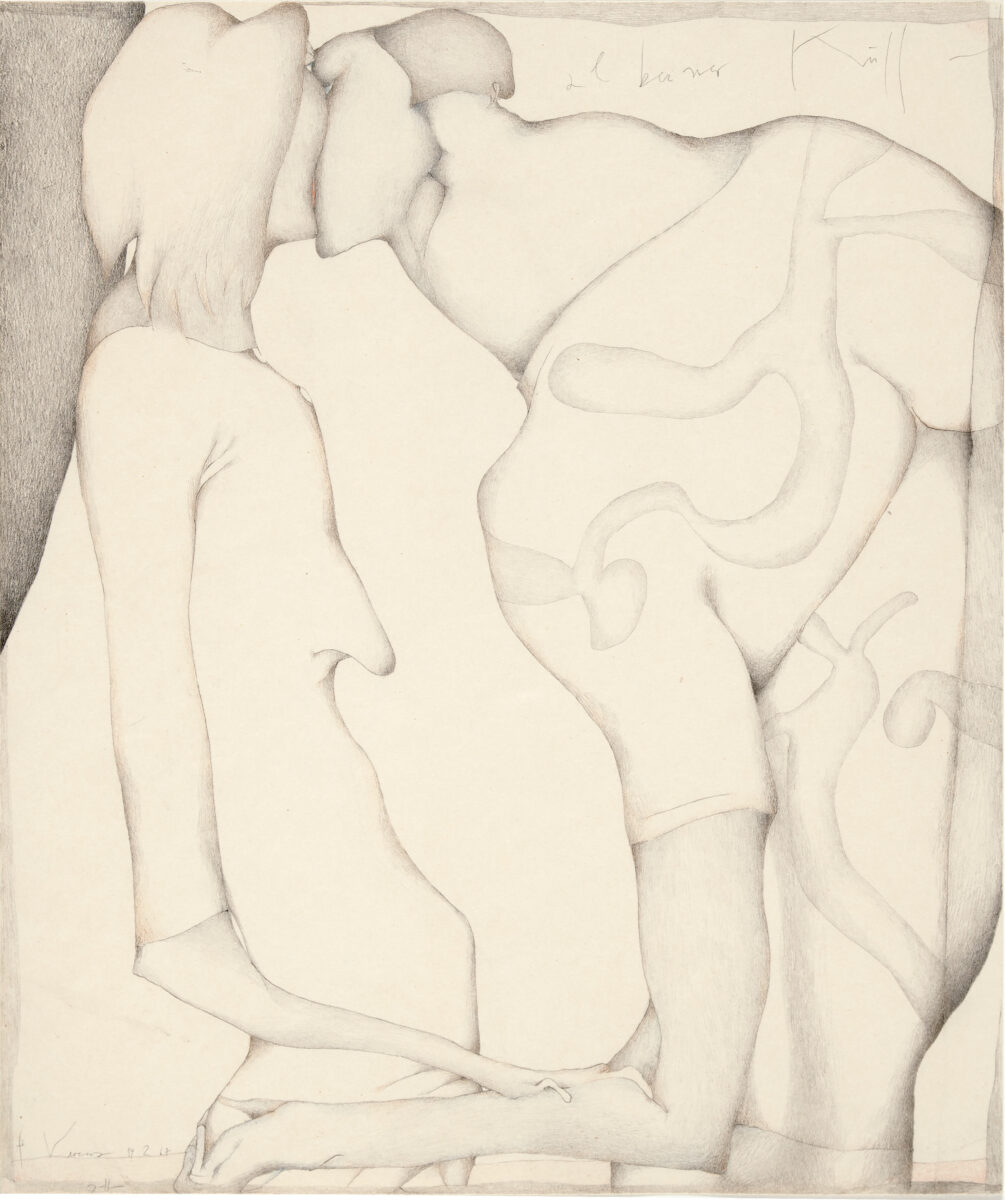 Alberner Kuss. Bunt- u. Bleistift auf leichtem chamoisfarbenen Karton. 1967. 38 x 32 cm, im Passepartout freigestellt. Unter Glas gerahmt.