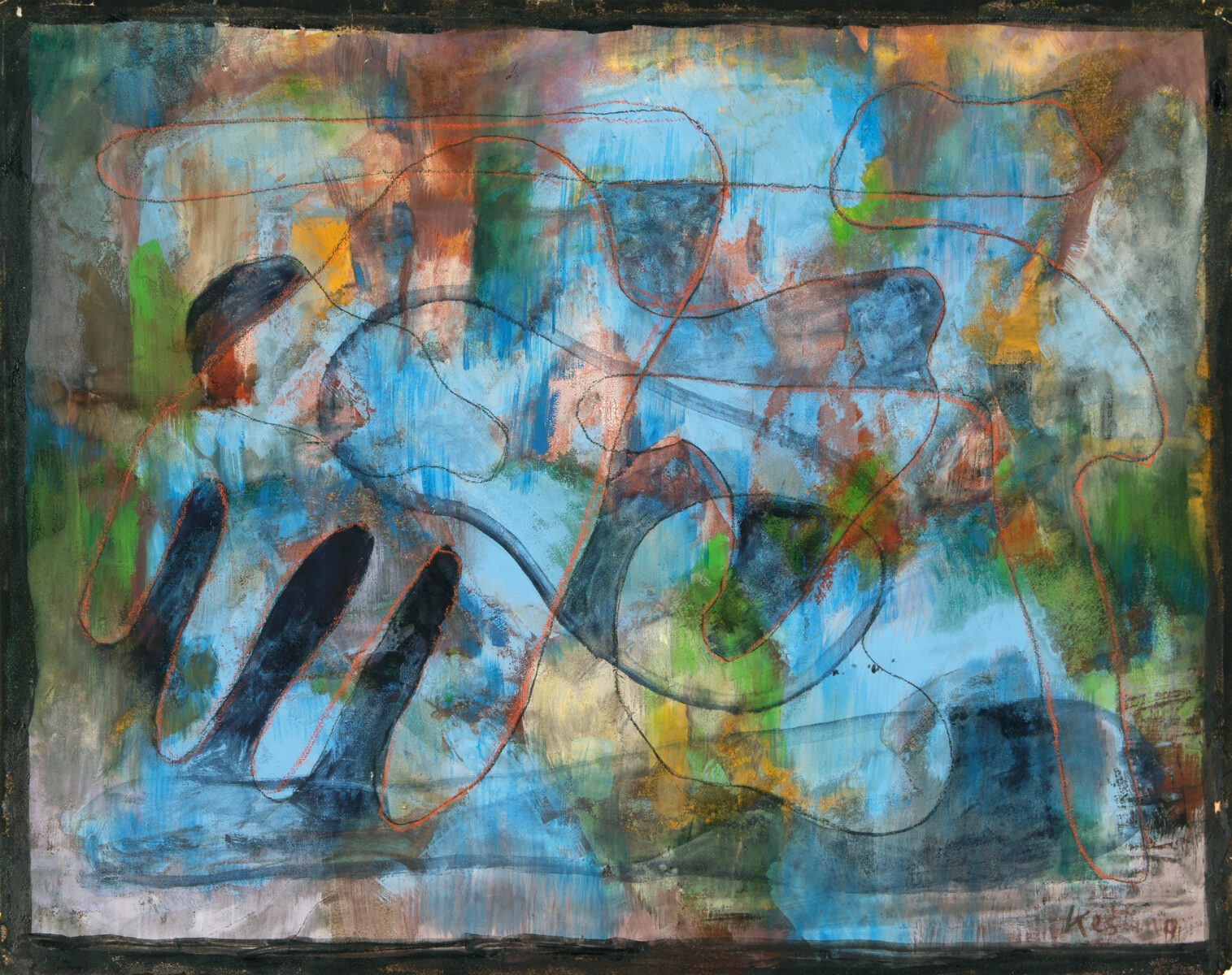 o.T. (Abstrakte Komposition). Mischtechnik (Aquarell, Tempera u. Farbkreide) auf Karton. 1927. 30,9 x 40,5 cm, im Passepartout freigestellt. Unter Glas gerahmt.