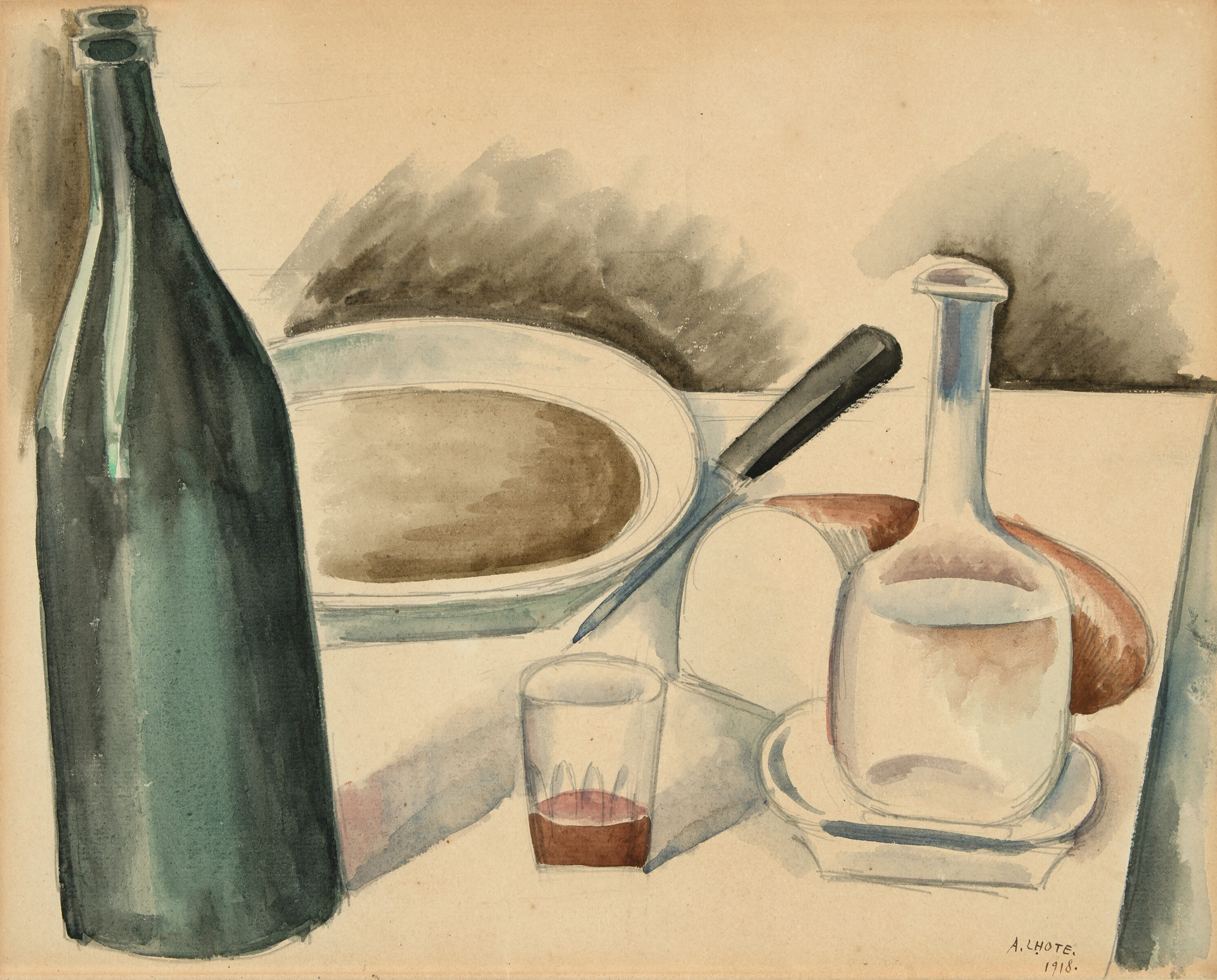 Tischstilleben. Aquarell über Bleistift auf chamoisfarbenem Bütten auf Karton. 1918. 25 x 31,8 cm, unter Passepartout. Unter Glas gerahmt.
