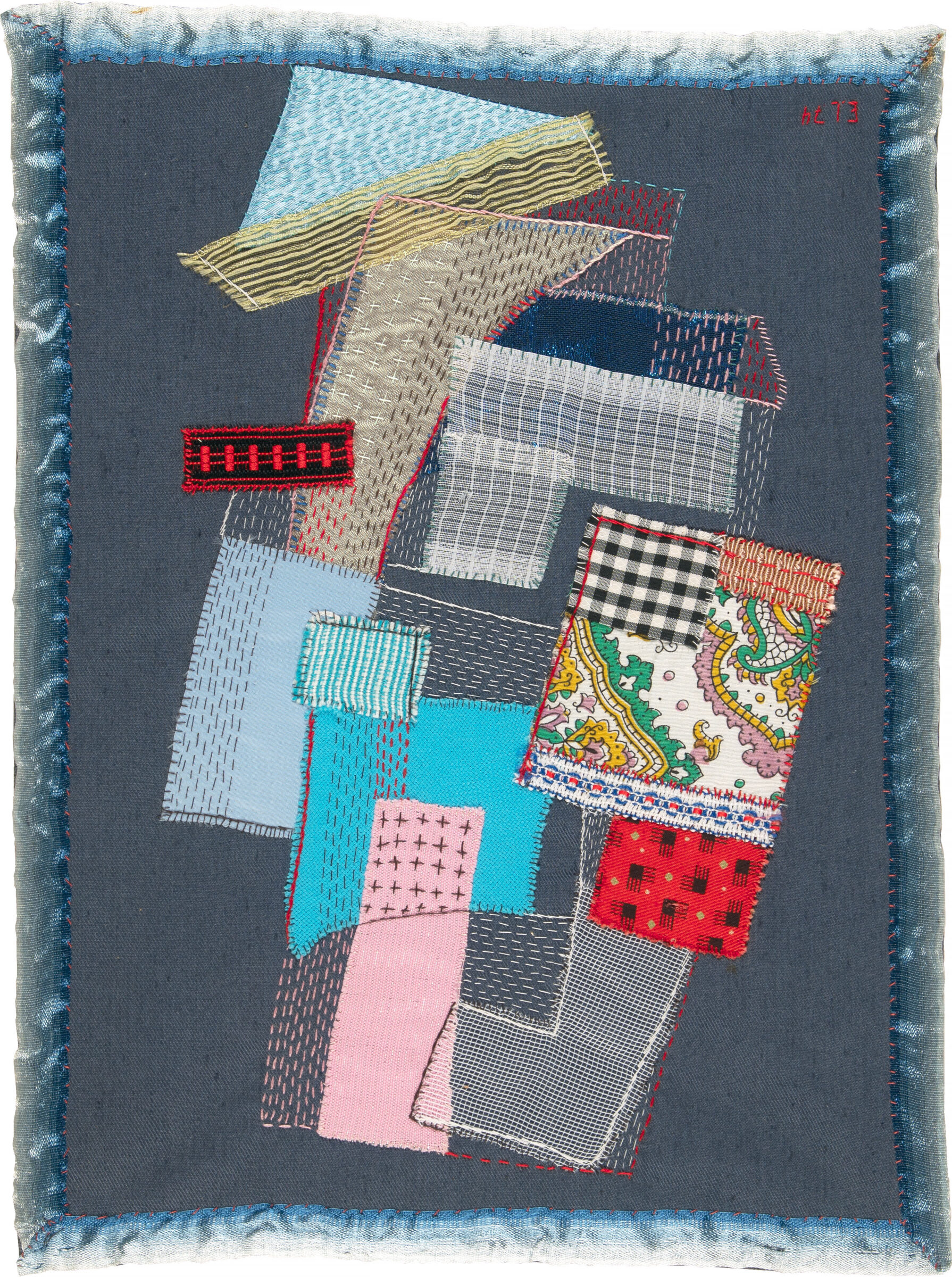 o.T. (Abstrakte Komposition). Applikation (verschiedene Stoffe, Garn). 1974. 38 x 28 cm. Unter Glas gerahmt.