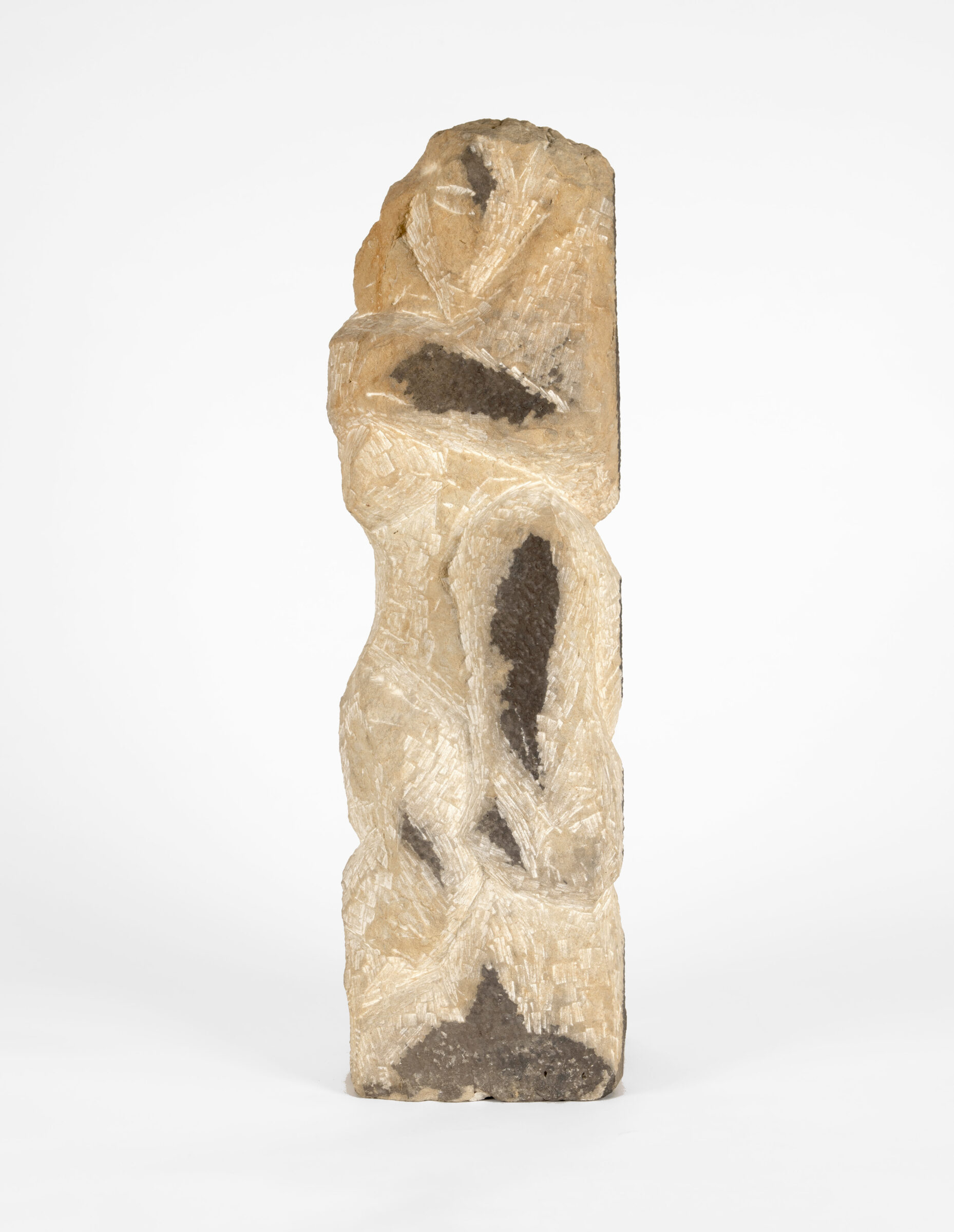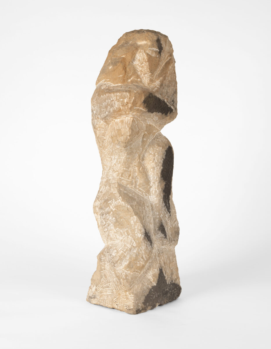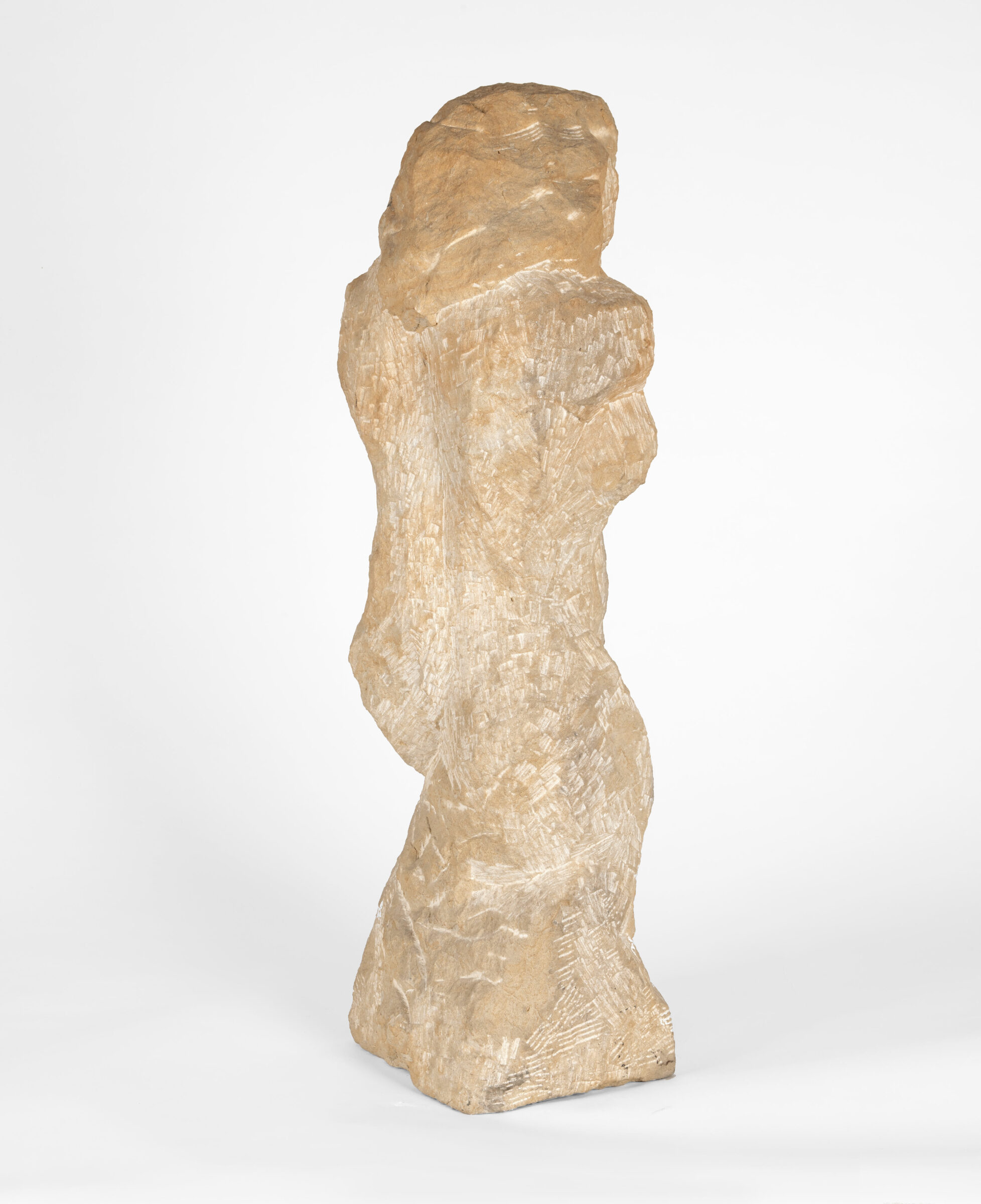 Weibliche Figur. Sandstein, teilweise naturbelassen. 75,5 x 23,5 x 21,5 cm.