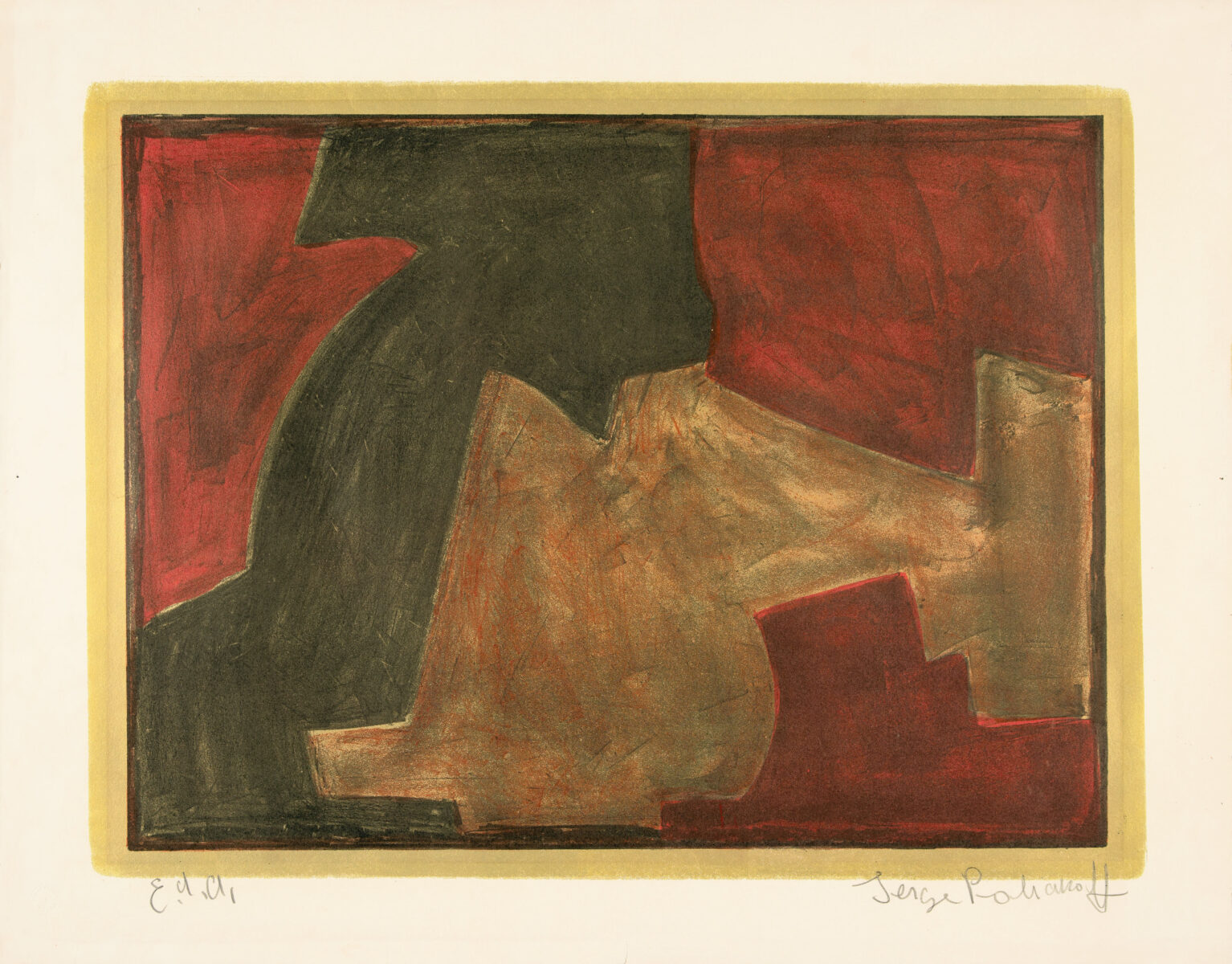 Composition verte, bleue et rouge. Farblithographie auf chamoisfarbenem Rives Büttenkarton. 1965. 52 x 68,5 (63,5 x 80,5) cm, unter Passepartout. Unter Glas gerahmt.