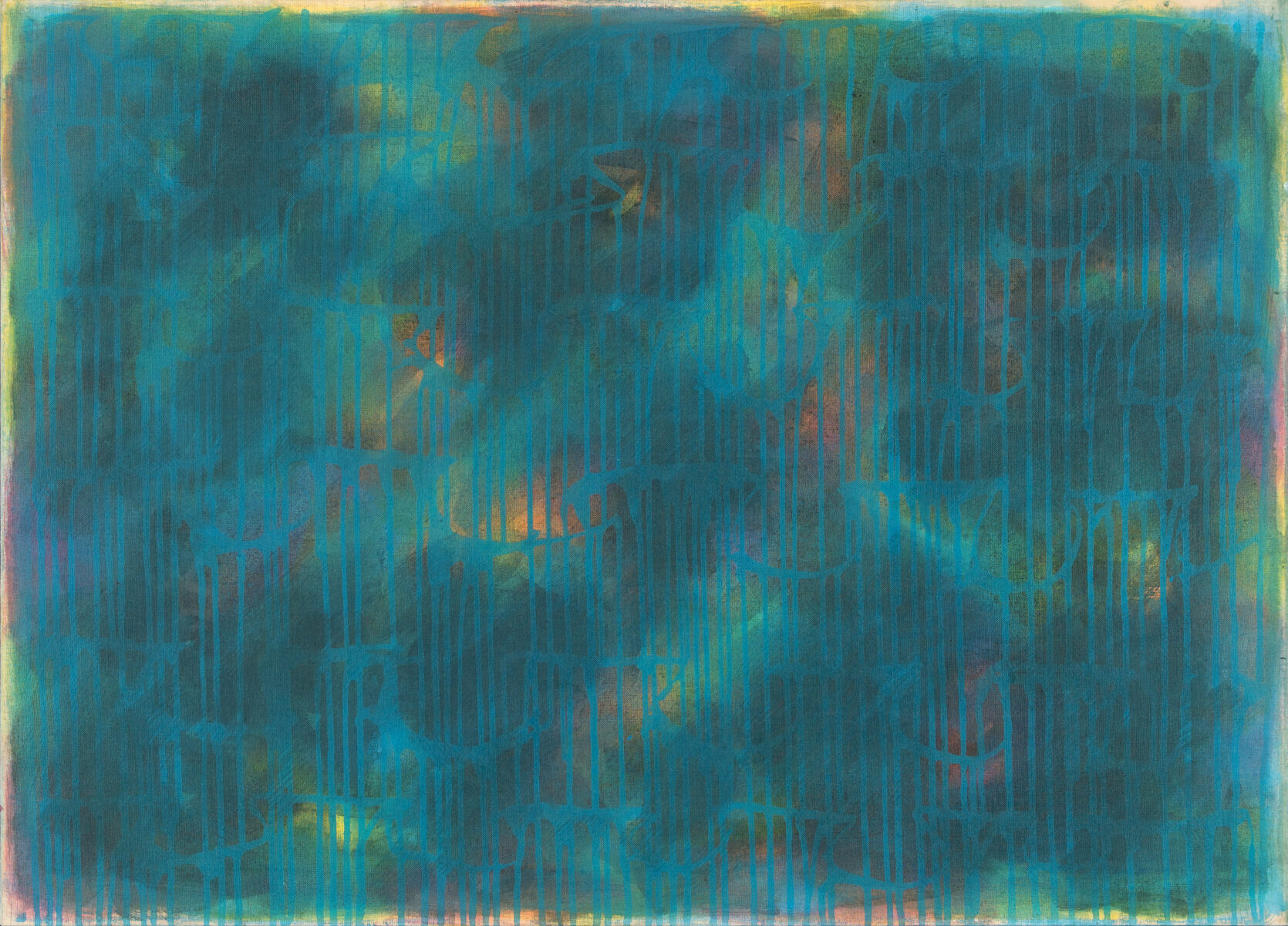 o.T. (Netzbild, Blau über Blaugrün). Acryl auf Leinwand. 1981. 65 x 90 cm. Gerahmt.