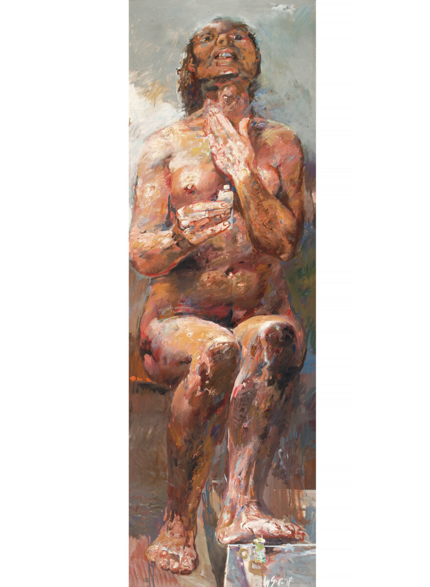 Morgentoilette. Öl auf Hartfaser. 1978. 170,5 x 55,5 cm. Gerahmt.