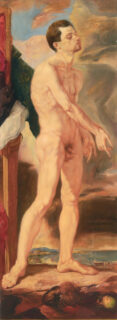 Adam und Eva. Diptychon. Öl auf Holz. 1970. Jeweils 110 x 40 cm. Zusammen gerahmt (Rahmenmaß des Diptychons: 117,5 x 90,5 cm).