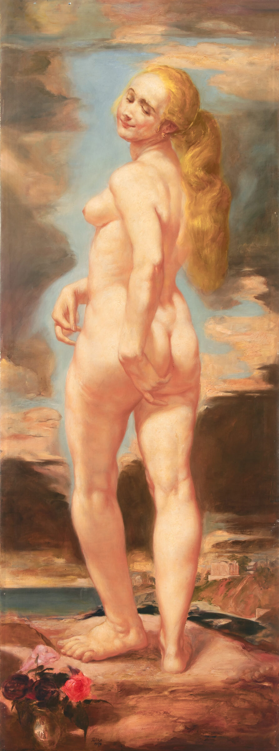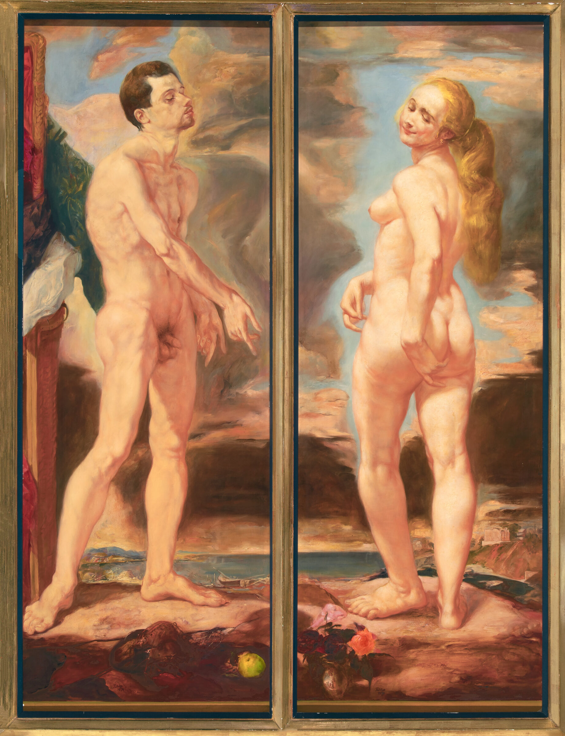 Schulz 107 - Provenienz: Sammlung Rudolf Zuckermann, Halle, von diesem um 1970 direkt beim Künstler erworben, seitdem in Familienbesitz. - Abgebildet in: Günter Meißner, Werner Tübke. Leben und Werk, Leipzig 1989, Abb. 99, S. 163. - Mit weichen Bildverläufen schuf Tübke ein spontan gezeichnetes und lebensnahes Bild von zwei Zeitgenossen als Erben klassischer Schönheitsvorstellungen. "Diese zeitlose Deutung verdichtete sich nicht zufällig 1970 in einigen groß empfundenen Aktgemälden, die in 'Adam und Eva', dem Urbild paradiesischen Menschseins, kulminieren. Tübkes Diptychon vom ersten mythischen Menschenpaar, das die Künstler vieler Epochen - namentlich der Renaissance - als Inbegriff idealer körperlicher Vollkommenheit gestaltet haben, hebt ein altes Leitbild des Humanen übergangslos in die Gegenwart." (Günter Meißner 1989, S. 159) - Die linke Tafel mit minimalen Randläsuren.