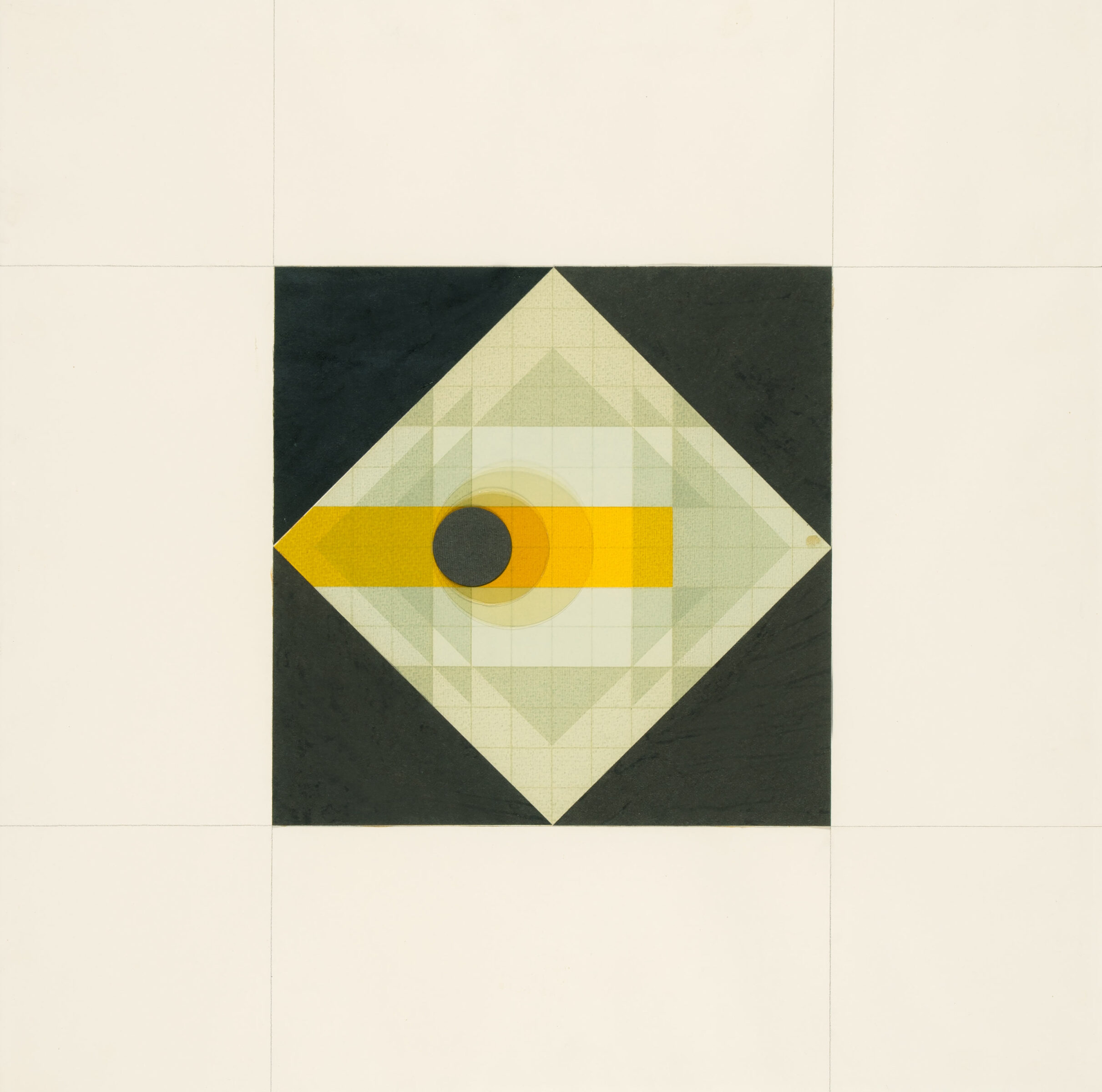 Transparente und nicht transparente Schichtungen von Dreiecken und Punkten unter teilweiser Einbeziehung von Folie. Collage aus verschiedenen Papieren u. Folie über Bleistift auf chamoisfarbenem Karton. 1980. 63 x 63 cm. Unter Glas gerahmt.