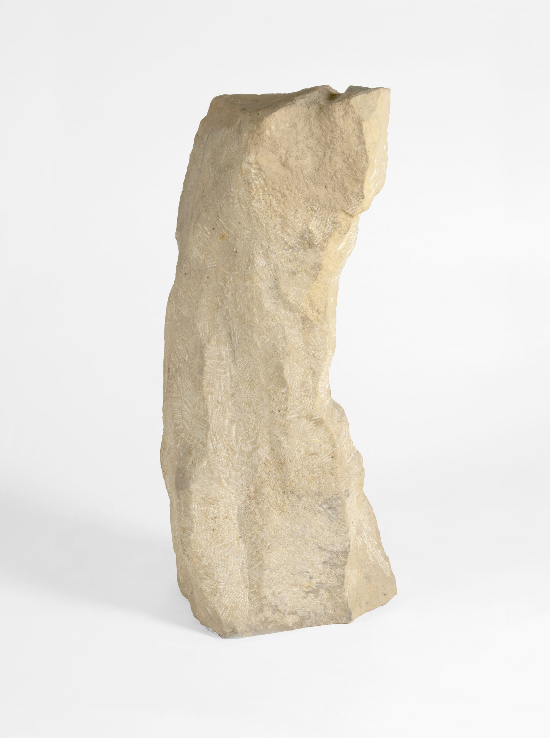 Provenienz: Vom Vorbesitzer direkt beim Künstler erworben.- Unser Torso zeigt Werner Stötzers zutiefst menschliche Haltung gegenüber der figürlichen Skulptur: Sein Stein scheint aus sich selbst heraus zu wachsen, mehr gesetzt als gemeißelt, und bewahrt zugleich Spuren des Bearbeitungsprozesses als Teil seiner Präsenz. Stötzers lebenslanges Interesse an der Reduktion der menschlichen Gestalt auf archaische, fragmentarische Formen kommt hier in konzentrierter Form zum Ausdruck: Die Figur ist kein idealisierter Leib, sondern ein "Gehäuse" des Erlebens, in dem Volumen, Oberfläche und Kontur in einem poetischen Gleichgewicht stehen. Für Stötzer - einer der bedeutendsten deutschen Bildhauer der zweiten Hälfte des 20. Jahrhunderts - waren Torsi ein zentrales Thema seines Ouvres, in dem er Körperhaltungen, Umrisslinien und die residuale Kraft des Bruchs immer wieder neu auslotete. Seine Arbeit ist geprägt von der Überzeugung, dass jedem Stein ein eigenes Gesetz innewohnt, dem der Bildhauer folgen müsse, um die innere Spannung der Figur freizulegen.