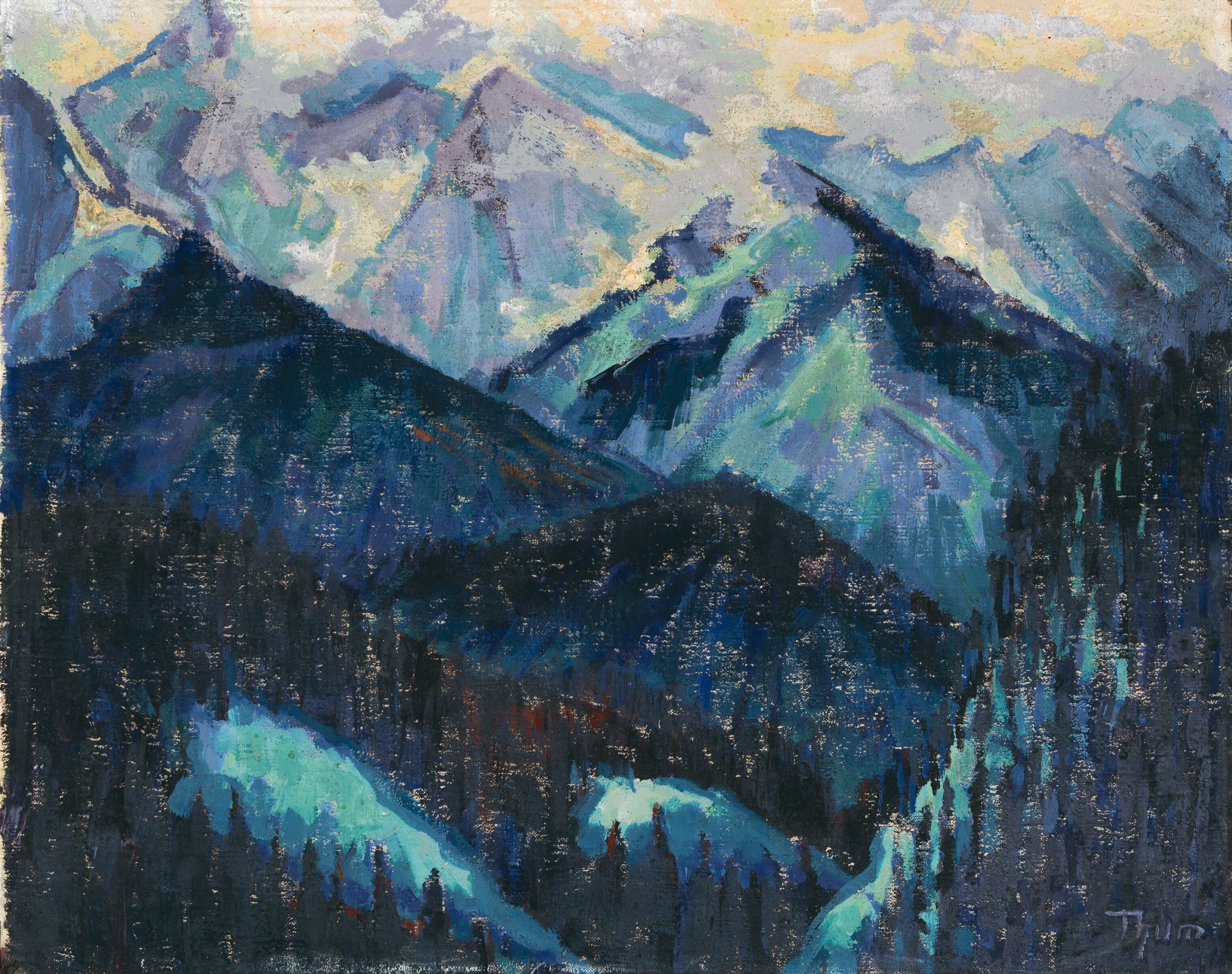 Elfriede Thum studierte ab 1905 an der Universität Lausanne und ging anschließend nach Dresden, um von Charles Johann Palmié unterrichtet zu werden. Besonders beeinflusst wurde Thum von den Arbeiten des Schweizer Künstlers Giovanni Segantini, der vor allem für seine Gebirgslandschaften und Freilichtmalerei bekannt ist. Da sie als Frau wenig Möglichkeiten erhielt auszustellen, signierte sie häufig mit "Erich" Thum. 1909 weilte sie in Nidden, lernte dort Max Pechstein kennen und erwarb kurz darauf in Tzschetschnow bei Frankfurt (Oder) ein Grundstück. 1913 heiratete sie Rolf Lauckner, den Stiefsohn des Schriftstellers Hermann Sudermann, und nannte ihr Haus, in Anlehnung an Sudermanns Roman "Der Katzensteg", den "Katzengrund". Die 20er Jahre markieren den Höhepunkt ihres Schaffens. Zu dieser Zeit waren ihre Werke in zahlreichen Gruppen- und Einzelausstellungen unter anderem in Berlin, Stuttgart und München zu sehen. Später erhielt die von den Nationalsozialisten als "entartet" diffamierte Künstlerin Ausstellungsverbot. - Stellenweise leichtes Craquelé. Die Leinwand in der linken unteren Ecke mit einer von der Künstlerin selbst retuschierten Läsur. Zwei kleine Löchlein.
