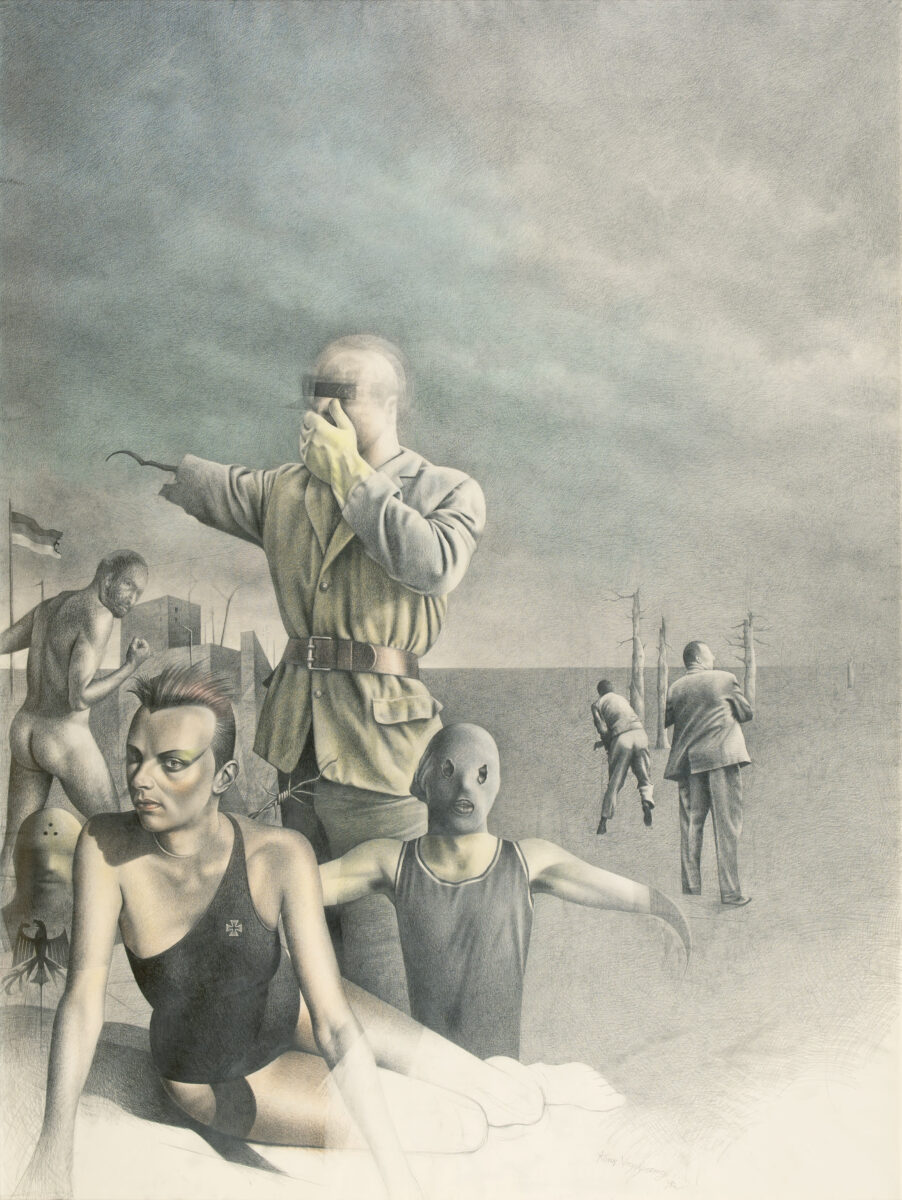 Provenienz: Vom Vorbesitzer direkt beim Künstler erworben. - Ausgestellt und abgebildet in: Großstadtdschungel. Neuer Realismus aus Berlin. München, Kunstverein, 1983, S. 55. - Klaus Vogelgesang zählt zu den markantesten Vertretern der Berliner Realisten. Sein Werk ist durch eine außerordentlich präzise, beinahe altmeisterliche Zeichentechnik geprägt, die er mit inhaltlich scharf zugespitzten Themen verbindet. Bereits seit den 1970er Jahren positionierte er sich deutlich als politisch engagierter Künstler, der die Schattenseiten von Macht, Gewalt und gesellschaftlicher Verdrängung ins Bild rückte. - Unsere großformatige Zeichnung "Mit erhobenem Arm" steht exemplarisch für dieses künstlerische Programm, das die verdrängten Schattenseiten der Geschichte sichtbar macht. Immer wieder thematisierte der Künstler die Nachwirkungen des Nationalsozialismus, die Persistenz autoritärer Strukturen und die Bereitschaft zur Verdrängung in der deutschen Nachkriegsgesellschaft. Auch hier lassen sich Anspielungen auf faschistische Symbolik, auf den Mythos des starken Körpers und auf die Uniformierung individueller Identität erkennen. - Vogelgesangs plastisch präsente Figuren sind keine Zitate der Vergangenheit, sondern archetypische Gestalten, die Machtmechanismen und Abhängigkeiten sichtbar machen, die jederzeit wiederkehren können. Die unheilvolle Atmosphäre des weiten, wolkenverhangenen Bildraumes, die Maskierung der Körper und die Geste des "erhobenen Arms" verweisen auf Mechanismen kollektiver Blindheit und Unterwerfung, die über das Jahr 1982 hinaus bis in die Gegenwart hinein von bedrückender Aktualität sind. - Innerhalb der Berliner Realisten kam Vogelgesang eine radikal-konsequente Position zu. Seine Bilder vermeiden jede Glätte oder Symbolisierung; sie konfrontieren den Betrachter mit schonungslosen Szenarien, die nicht selten auf historische wie aktuelle Ereignisse anspielen. In dieser Direktheit unterscheidet er sich von den oft ironisch-bitteren Kommentaren eines Peter Sorge oder den surreal verdichteten Bildräumen eines Wolfgang Petrick. Lange Zeit standen Vogelgesangs Arbeiten, ebenso wie die seiner Kollegen, abseits des kunsthistorischen Mainstreams. In der Zwischenzeit wird jedoch deutlich, dass Künstler wie Vogelgesang einen unverzichtbaren Beitrag zur Kunst nach 1945 geleistet haben: Sie hielten am Gegenbild zur Verdrängung fest und machten sichtbar, was die Gesellschaft zu übersehen gedachte.
