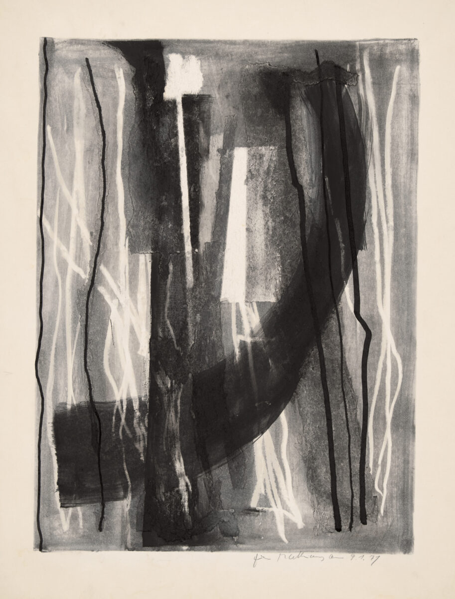 o.T. Mischtechnik (Öl, Wachs, Tusche) auf chamoisfarbenem Karton. 1971. 57,2 x 43,2 cm, unter Passepartout. Unter Glas gerahmt.