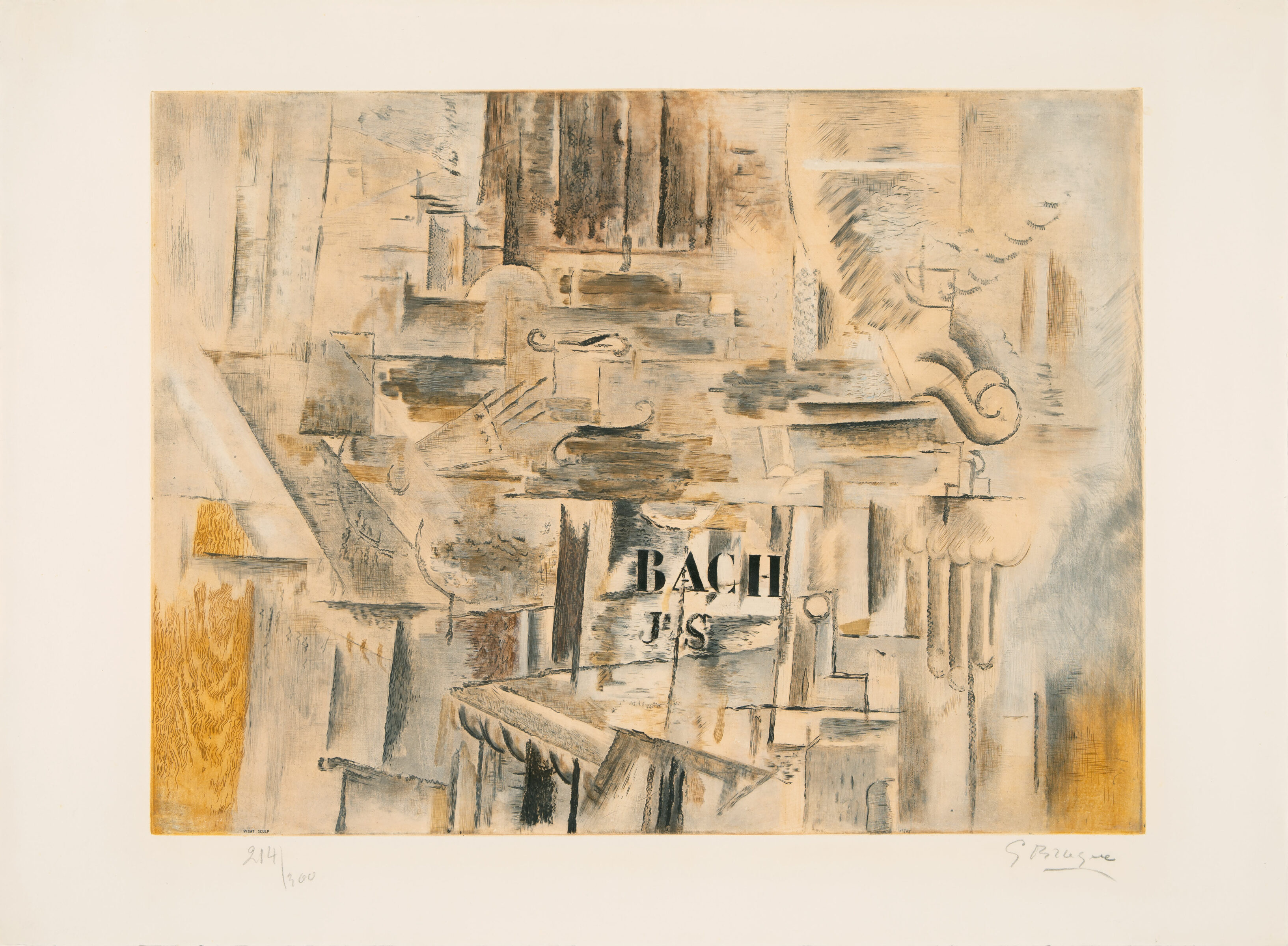 Hommage à J.S. Bach. Farbradierung auf chamoisfarbenem BFK Rives Büttenkarton. 1950. 44 x 58,5 (56 x 76) cm, im Passepartout freigestellt. Unter Glas gerahmt.