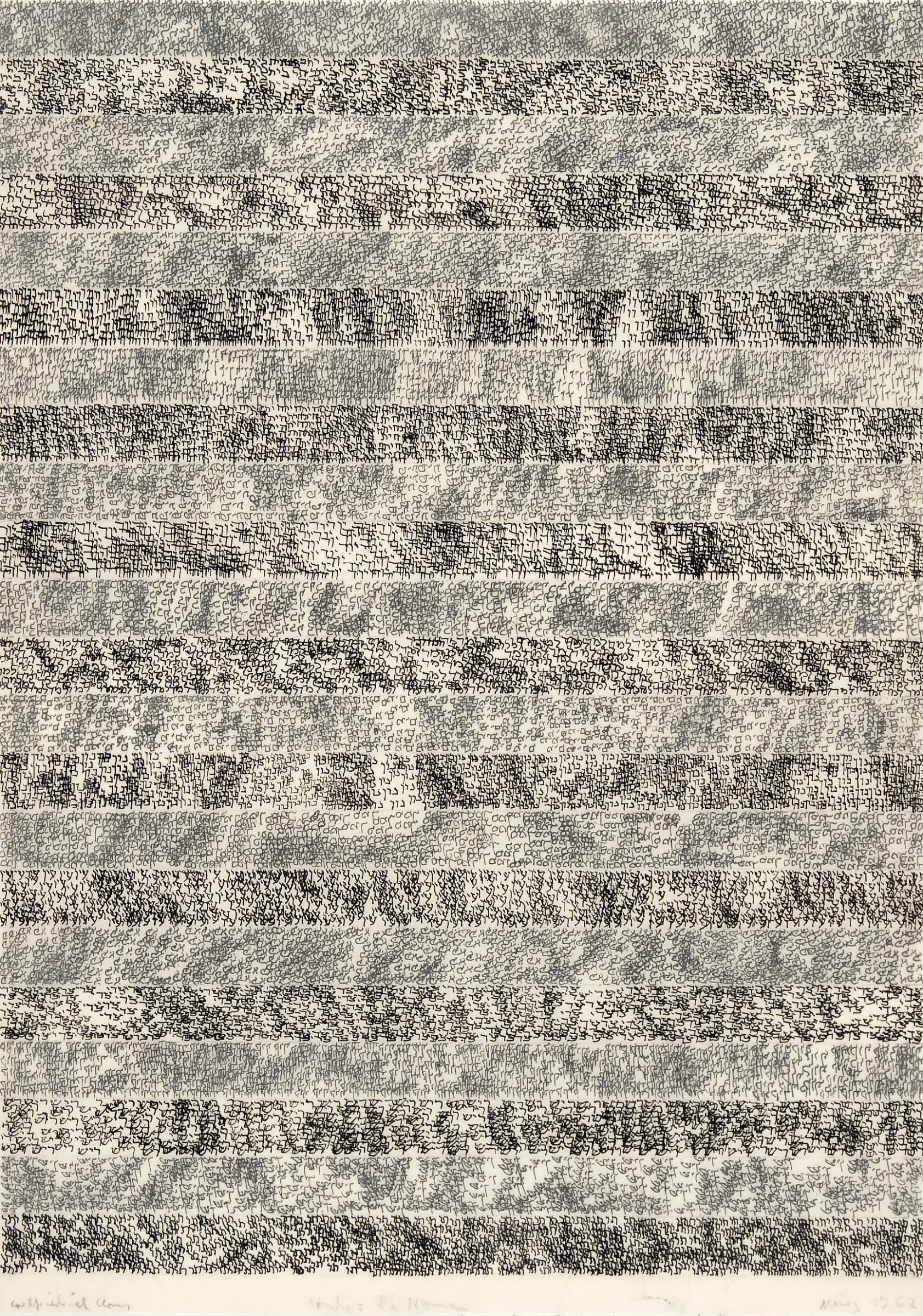 Werner Z 275 - Provenienz: Will Grohmann, Berlin; Sammlung Mário Calábria, Berlin; seit 1997 Privatsammlung Berlin. - Ausgestellt und teils abgebildet in: Carlfriedrich Claus. Freiberg, Privaträume von Dr. H. Grüß, 1962; Schrift und Bild. Amsterdam, Stedelijk Museum, 1963, S. 164; Carlfriedrich Claus. Notizen zwischen der experimentellen Arbeit - zu ihr. Einzelausstellung innerhalb der Ausstellung "Illustrationen". Baden-Baden, Kunsthalle, 1964, Einband; Deutschlandbilder. Kunst aus einem geteilten Land. Berlin, Martin-Gropius-Bau, 1997, Katalog-Nr. 287; Die Künstlerfreundschaft zwischen Franz Mon und Carlfriedrich Claus. Chemnitz, Kunstsammlungen, 2013, S. 105 sowie in: Carlfriedrich Claus. 1930-1998. Denklandschaften. Berlin, Kupferstichkabinett in der Neuen Nationalgalerie, 2014. - Durch seinen experimentellen Umgang mit Sprache und im Kontext der visuellen Poesie entwickelte Claus um 1960 den neuen Bildtypus des "Sprachblattes". Geschult durch die Schriften von Karl Marx, Rudolf Steiner, Ernst Bloch und weiteren Quellen der jüdisch-christlichen sowie fernöstlichen Ideengeschichte kristallisierte er auf feinen Papieren zeichnend-schreibend sein Denken. Die oft beidseitig auf transparenten Bildunterlagen ausgeführten Arbeiten und grafisch höchst reizvollen Bildgespinste veranschaulichen Prozessuales wie Dialektisches. Sie sind über ausführliche Einzeltitel entschlüsselbare Textstellen oder signalhaft wiederkehrende Zeichen erschließbar, oft aber nicht endgültig zu enträtseln. (Vgl. Carlfriedrich Claus. 1930-1998. Denklandschaften. Berlin, Neue Nationalgalerie, 2014, online) Auf "Studie: Die Namen" sind die 22 Buchstaben des hebräischen Alphabets, die im Wechsel der Papierseite aufeinander folgen, ausgeschrieben. "Jeder Buchstabe ist hier vielsinnig, löst durch seine im aktiven Betrachter aktive Präsenz Prozesse auf verschiedenen Ebenen aus: geistigen, seelischen, körperlichen, weist auf je anderes da, das wieder weiterverweist. Zuletzt aber, auf der vorletzten Stufe der Meditation, ist dieses ganze derart entfaltete, sich an jedem Punkt, in alle Dimensionen weiterentfaltende messianisch-mystische Schriftwerk nur eine einzige große Hieroglyphe, ein einiges zusammenhängendes Symbol des Einen, Namenlosen, zuletzt verweist dann jeder Buchstabe von seiner Zeit-Stelle aus auf den, ja wird Zeit-Glied dessen, der als: 'Eh'je ascher eh'je' - 'Ich werde sein, der ich sein werde' sich vor-aussagte. Die Thora, alle hier und so versammelten Konsonanten: der noch Unausgesprochene, noch Unaussprechbare zuhöchst -: Ha-Schem: Der Name. Zu sich unterwegs." (Claus, Vexier-, Sinn-Bilder, in: Katalog Baden-Baden 1964, S. 9-10)