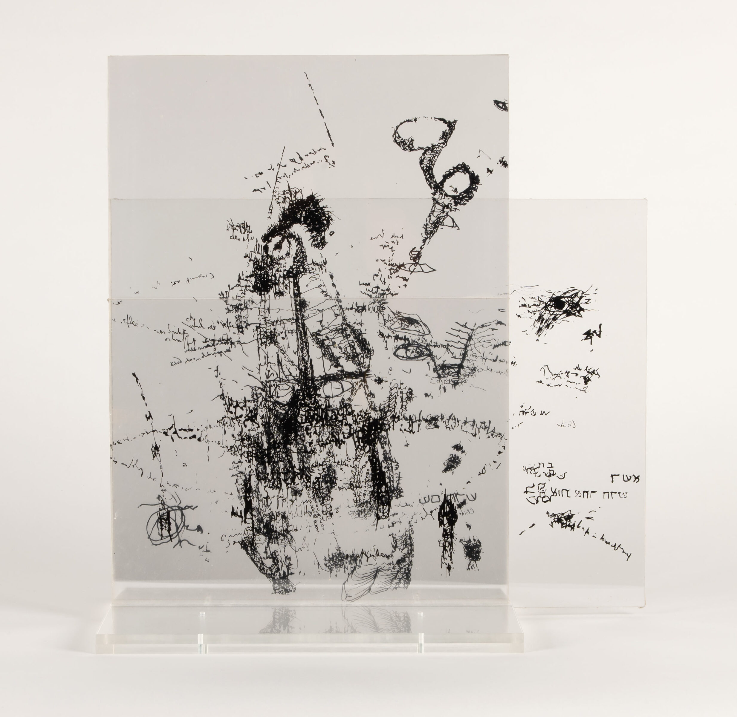 Glasgliedernde Leere, in der Sprache agiert. Komplex-Objekt. Siebdruck auf 11 Plexiglasplatten, zusammen auf Plexiglassockel verschraubt. 1962/90. 47,2 x 45 x 20,2 cm.
