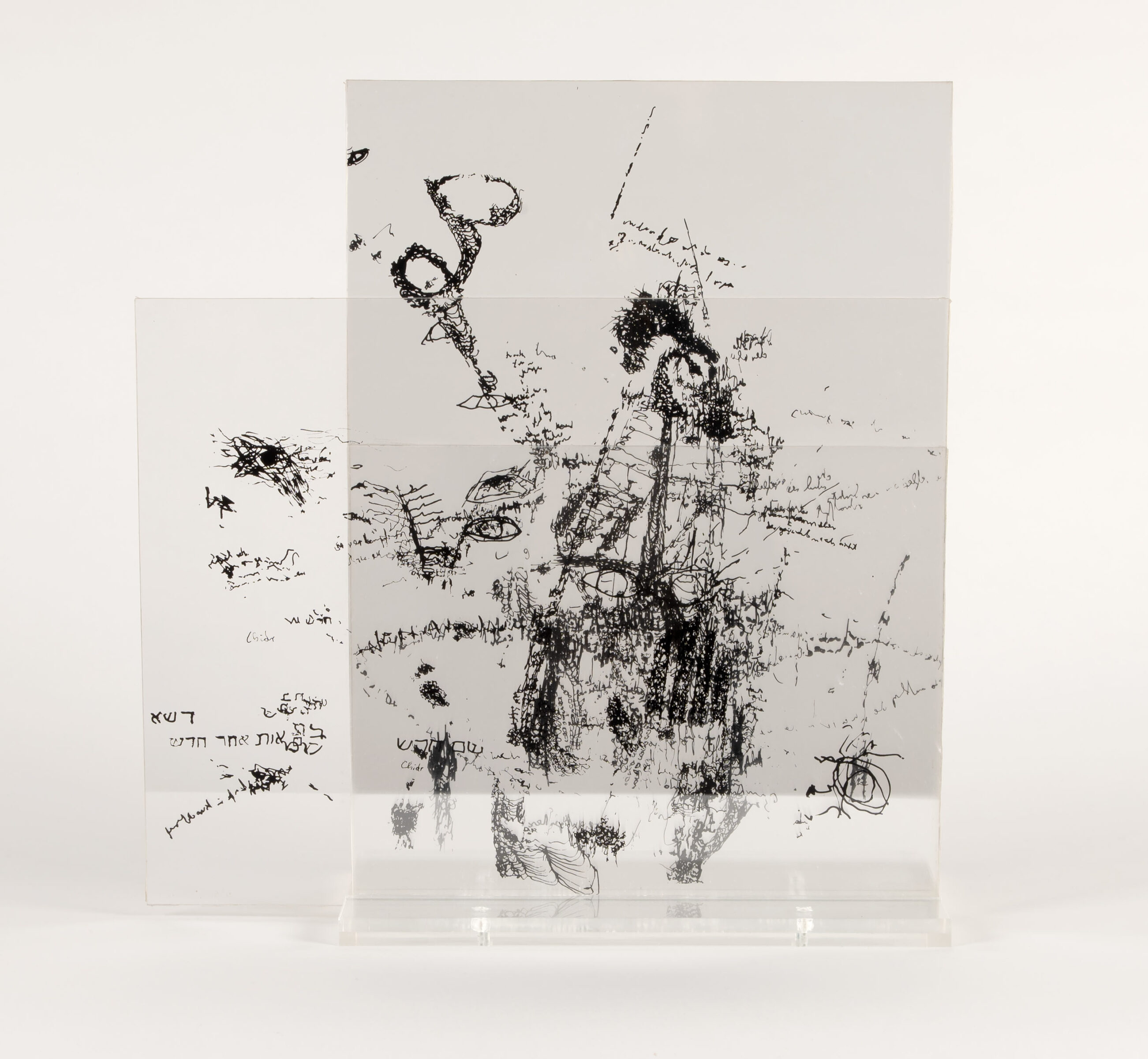 Vgl. Werner Z 297 - Entstanden um 1990 nach dem gleichnamigen Glasobjekt von 1962. - Provenienz: Nachlass Klaus Werner, Leipzig; Privatsammlung Berlin (seit 2007). - Ausgestellt in: Carlfriedrich Claus. 1930-1998. Denklandschaften. Berlin, Kupferstichkabinett in der Neuen Nationalgalerie, 2014. - Die Möglichkeit der Durchdringung von Schrift und Raum ist ein zentrales Anliegen in der Kunst von Carlfriedrich Claus. Dazu hielt er 1962 in einem Brief fest: "...Glasplatten, denk-beschriftet, Raumbildung aus Schrift. Und auch 'Gedanken-Vegetation in wiederholter Spiegelung', bestehend aus 8 Spiegeln und einigen Glasplatten; imaginärer Raum: mehrfache Spiegelung stellt ihn her. Aber hindurch (durch diese quasi Kristall-Entstehung, Reflex-Geometrie) zweigt, ästelt, wuchert schwarze und rote Denk-Schrift, die mögliche lebendige Fülle in durchsichtig gemachtem Stein be-inhaltend. Selbst mehrfach sich spiegelnd, überlagernd, in Pyramiden, Hohlräumen, imaginärer Erstreckung. Mit Übergängen von Lesbarem in verflochtene Gehänge zum wieder Lesbarem usw." (zitiert nach Werner, WVZ, 1990, S. 194) - Vereinzelt minimale Kratzspuren.