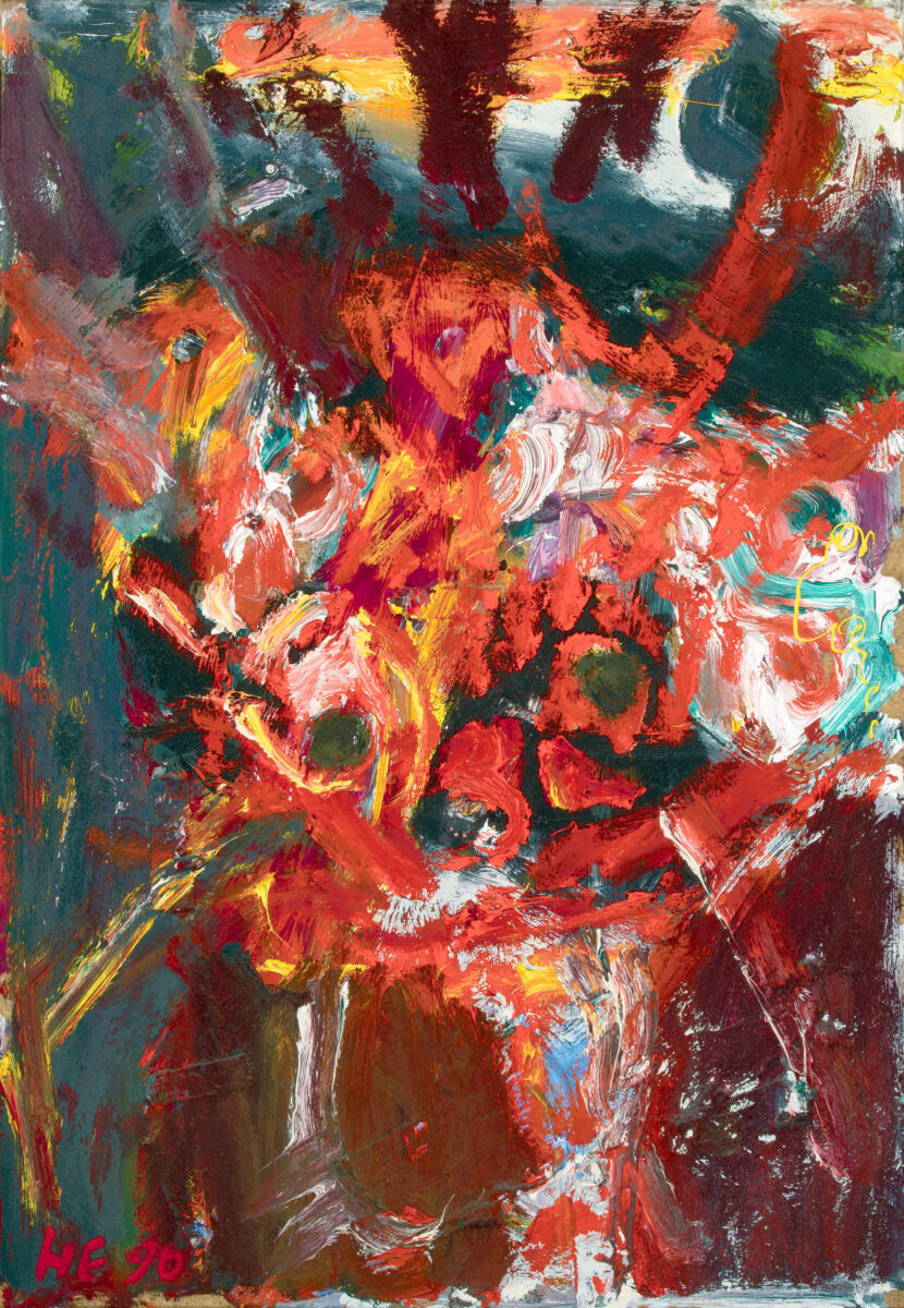 Drachenspiel IV. Öl u. Farbtuben auf Hartfaser. 1990. 130 x 90 cm. Im Original-Künstlerrahmen.