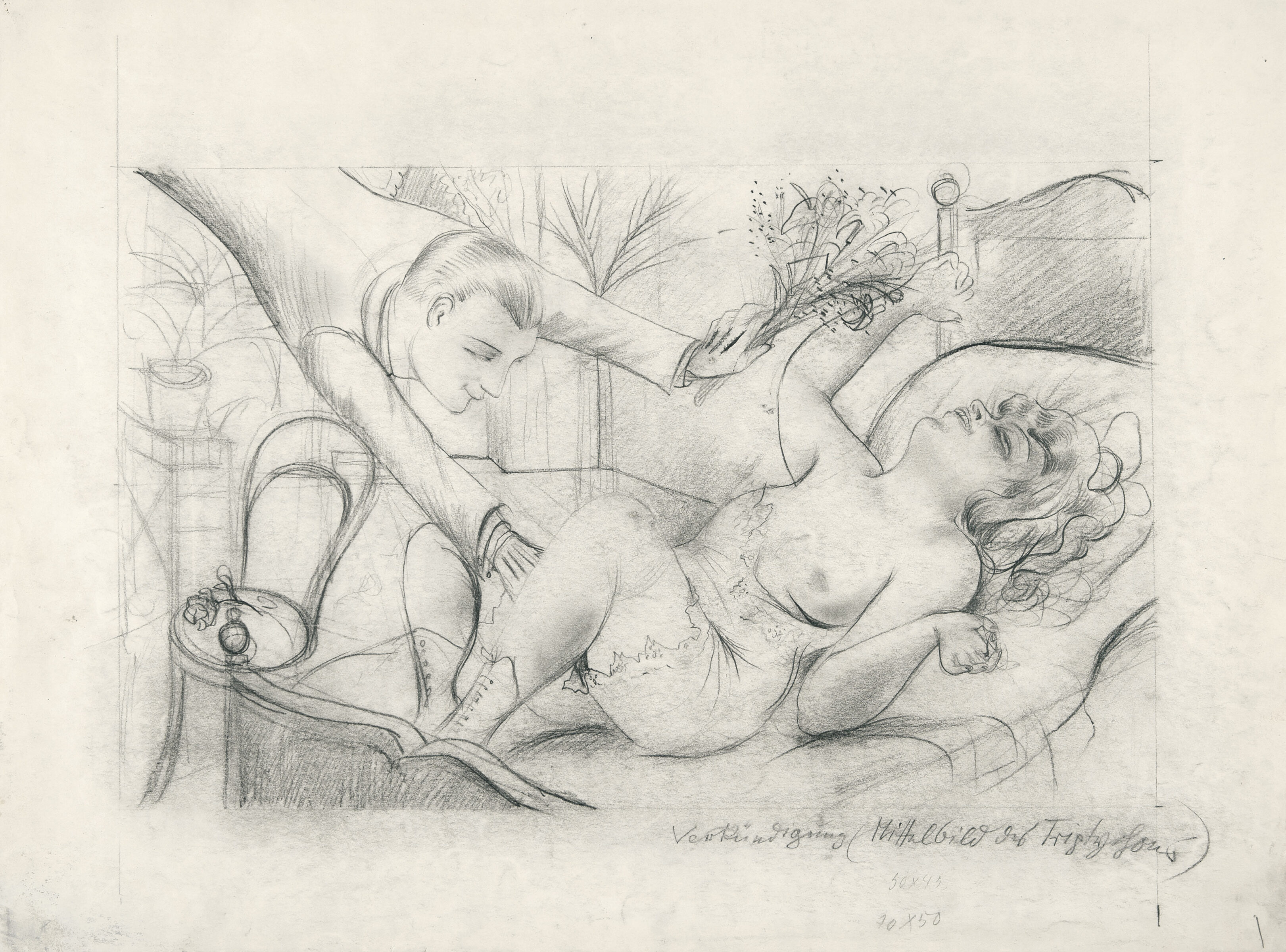 Lorenz EDV 8.1.1 - Provenienz: Privatsammlung Hessen. - Ausgestellt in: Otto Dix. Zum 100. Geburtstag, 1891-1991. Galerie der Stadt Stuttgart, 1991, Katalog-Nr. Z 1921/23-1; Otto Dix. Welt und Sinnlichkeit. Regensburg, Kunstforum Ostdeutsche Galerie u.a., 2005, Abb. S. 151; Dix, Beckmann, Mythos Welt. Mannheim, Kunsthalle u.a., 2013, Abb. S. 176 sowie abgebildet in: Sergiusz Michalski, Neue Sachlichkeit. Malerei, Graphik und Photographie in Deutschland, 1919-1933, Köln, 1992, S. 27; Andreas Strobl, Otto Dix. Eine Malerkarriere der zwanziger Jahre, Berlin 1996, Abb. 33. - Traditionell ist die Verkündigung durch den Erzengel an Maria eines der zentralen Motive der christlichen Kunst. In dieser Version allerdings wird das spirituelle Thema auf weltlich-erotische Weise neu interpretiert: Die mystische Empfängnis wandelt sich zur leidenschaftlichen Vereinigung unter dem Zeichen des Eros. Der "Engel", eine Selbstinszenierung von Dix, erscheint als Mischung aus Bote Gottes, Heiliger Geist und erotischer Gestalt, die dynamisch in den Schoß einer ekstatisch daliegenden "Madonna" hereinbricht. Als symbolisches Detail bringt er Lilien mit, Sinnbild für Jungfräulichkeit und Liebe. Religiöse Anspielungen ziehen sich durch viele Werke von Otto Dix. Die Inschrift lässt erkennen, dass die Zeichnung ursprünglich für den Mittelteil eines Triptychons vorgesehen war. Sowohl die präzise Ausführung als auch das große Format sprechen für eine ernsthafte Planung, die jedoch nie in Form eines Gemäldes umgesetzt wurde. Nur wenige Jahre später sollten die bekannten Triptychen "Die Großstadt" und "Der Krieg" entstehen, in denen Dix die Gegensätze zwischen Schein und Wirklichkeit in der Weimarer Republik sowie die Grausamkeit des Krieges thematisierte. Auch sie greifen auf die dreiteilige Form des Altarbildes zurück, um zeitgenössische Inhalte mit religiösen Bildstrukturen zu verschmelzen. - Der linke Blattrand vereinzelt mit kleinen Braunflecken.