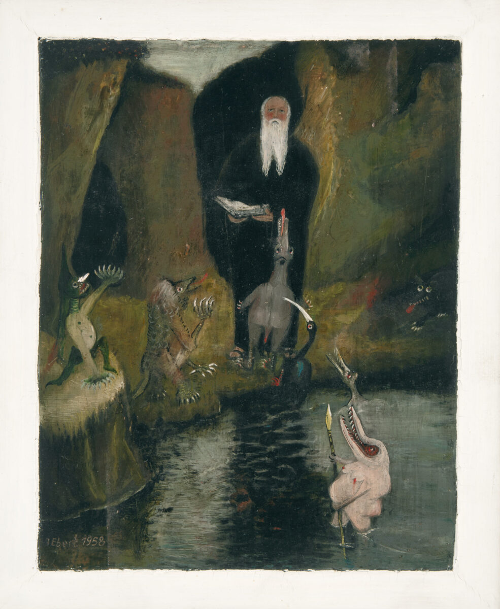 Die Versuchung des Heiligen Antonius I. Öl auf Hartfaser. 1958. 21,7 x 17,1 cm. Mit Original-Künstlerrahmen (25,7 x 21 cm).