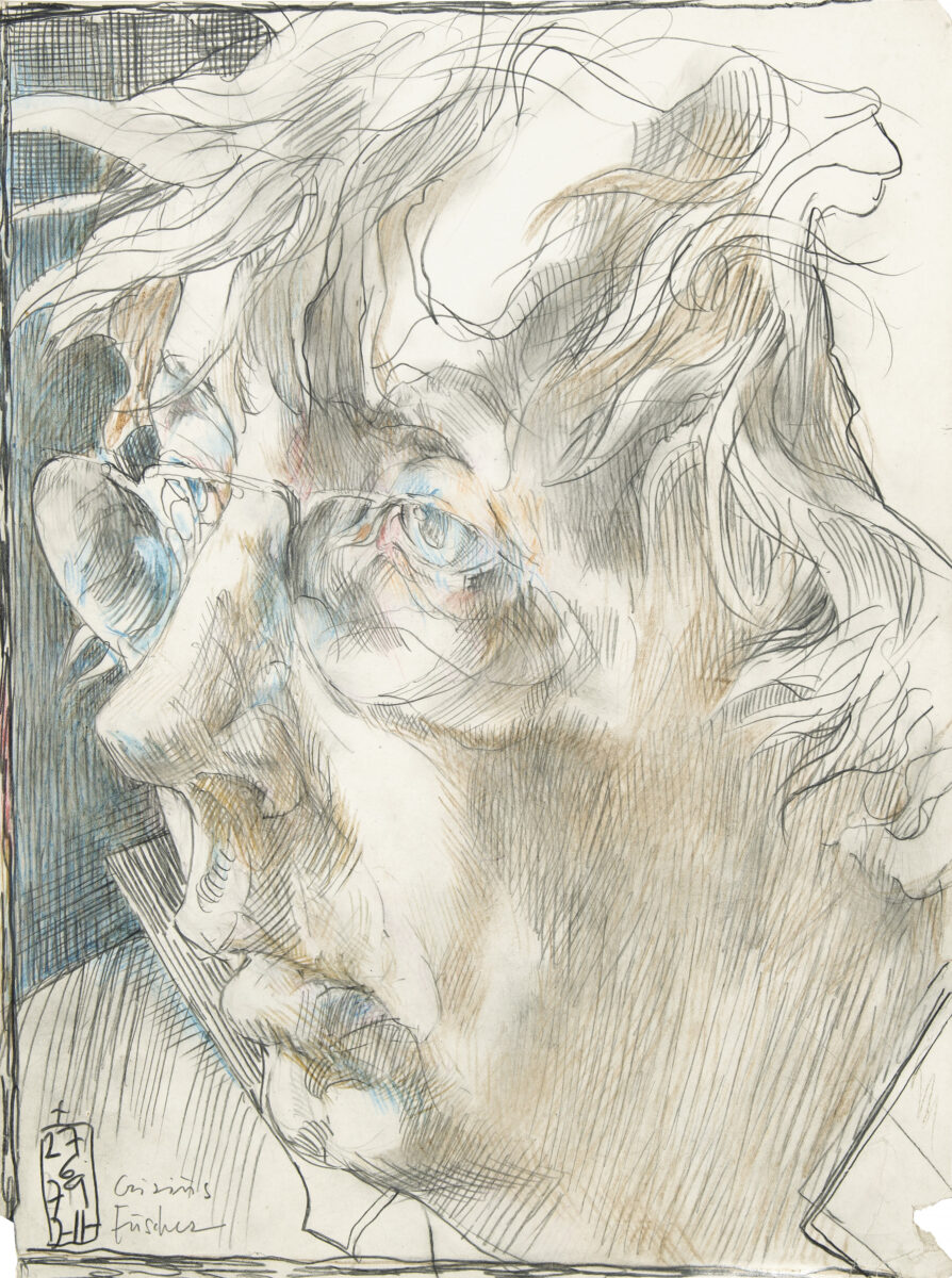 Gisius Fuscher (Selbst). Farb- u. Bleistift auf Papier. 1979. 32 x 24 cm, im Passepartout freigestellt. Unter Glas gerahmt.