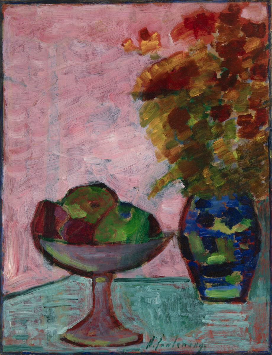 Stilleben mit Fruchtschale und Blumenvase. Öl über Bleistift auf Malpappe. Um 1932. 53,9 x 41,5 cm. Gerahmt.