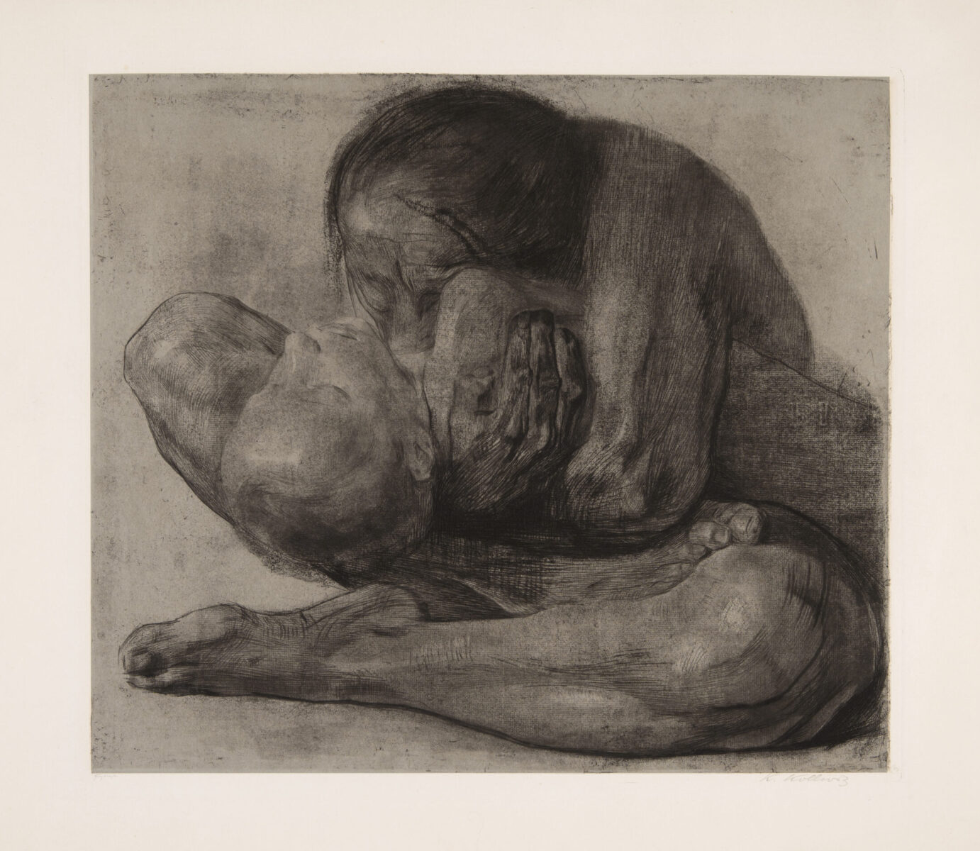 Frau mit totem Kind. Radierung auf gewalztem China auf Kupferdruckkarton. 1903. 41,2 x 47 (54,5 x 70,5) cm, unter Passepartout. Unter Glas gerahmt.