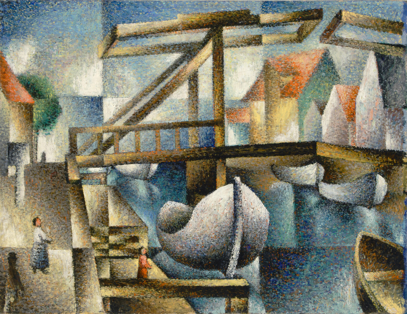 Die Brücke bildet das kompositorische Zentrum: Als diagonaler Impuls strukturiert sie den Raum und lenkt den Blick in die Tiefe, während die umgebenden Architektur- und Landschaftselemente in klar gefasste Farbflächen zerlegt werden. Segal organisiert das Bildfeld rhythmisch. Häuserkörper, Uferzonen und Wasserflächen erscheinen geometrisiert und mosaikartig gegeneinandergesetzt. Die Perspektive ist bewusst gebrochen; Raum entsteht nicht illusionistisch, sondern aus dem Spannungsverhältnis der Flächen. Farbe fungiert dabei als konstruktives Mittel: Warme Erd- und Rottöne stehen kühlen Blau- und Grünwerten gegenüber und erzeugen eine lebendige Balance zwischen Stabilität und Bewegung. Die sichtbare Pinselführung verleiht der Oberfläche eine vibrierende Präsenz, ohne die strenge Komposition aufzulösen.