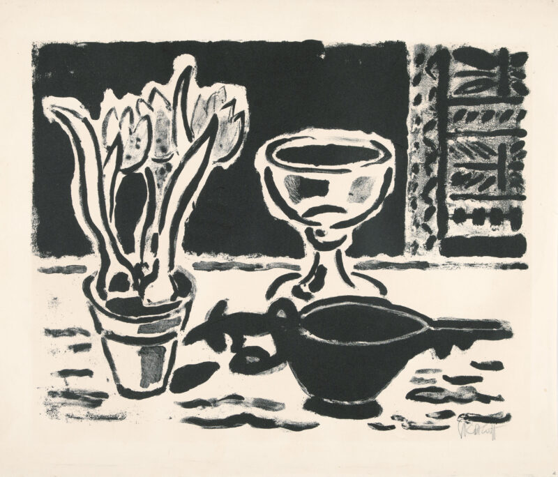 Stilleben mit Krokustopf. Lithographie auf leichtem Karton. 1953/54. 44 x 55,9 (54 x 64,2) cm, unter Passepartout.