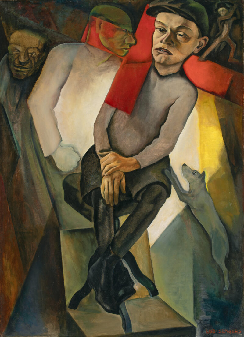 Abgebildet in: De kunst in nood. Een nationale uitgave tot steun aan de noodlijdende Nederlandsche beeldende kunstenaars, Den Haag, 1933, ohne Seitenangaben (beigegeben) sowie in: Dageraad van de Moderne Kunst. Leiden en omgeving 1890-1940. Zwolle, Waanders Uitgevers u.a., 1999, Abb. 466, S. 298. - Unser Gemälde zählt zu den zentralen Arbeiten von Lode Sengers und reflektiert in geballter Form die sozialen Spannungen der frühen Dreißigerjahre. Die Darstellung eines jugendlichen Laufburschen ist keine individuelle Charakterstudie, sondern fungiert als paradigmatische Figur sozialer Unsicherheit. Körperhaltung, Blickführung und Proportionen verweisen auf einen Zustand innerer Erschöpfung, der weniger psychisch begründet als vielmehr durch herrschende Rahmenbedingungen verursacht zu sein scheint: Der Körper dient als Austragungsort gesellschaftlicher Belastungen. Die Bildarchitektur wird von ausgeprägter Instabilität bestimmt. Schräge Raumachsen, fragmentierte Hintergrundelemente und klar voneinander abgegrenzte Farbsegmente erzeugen ein Spannungsfeld zwischen Figur und Umgebung. Die Komposition verzichtet auf perspektivische Beruhigung zugunsten einer bewusst konstruierten Unruhe. Leuchtende Rot- und Gelbflächen strukturieren den Bildraum und fungieren zugleich als visuelle Markierungen latenter Bedrohung. Diese Bedrohung konkretisiert sich in mehreren Details: Die im oberen rechten Bildbereich platzierte Figur mit einem Messer erscheint als symbolhaftes Zeichen potenzieller Gewalt - nicht als erzählerische Handlung, sondern als permanenter Möglichkeitszustand. Der Hund, der sich dem Jungen nähert, ist ebenfalls nicht im Sinne einer realistischen Darstellung zu lesen. In seiner Körperhaltung und Nähe zur Hauptfigur verkörpert das Tier latente Menschenfeindlichkeit sowie Mechanismen struktureller Grenzüberschreitungen. Eine zentrale Rolle spielt das rote Kreuz, das quer über Schulter und Oberkörper der Figur gelegt ist. Formal bildet es den grundlegenden Schwerpunkt der Komposition; inhaltlich eröffnet es ein ambivalentes Bedeutungsspektrum. Einerseits lässt sich das Motiv als individuelles Lastzeichen deuten - als visuelle Metapher für frühe Selbstverantwortung und verkörperte Überforderung. Andererseits gewinnt das Kreuz vor dem zeitgeschichtlichen Hintergrund des Jahres 1933 eine zusätzliche politische Dimension. Ohne explizite Ideologien zu benennen, evoziert die aggressive Farbigkeit Assoziationen an Symbole autoritärer Systeme und strukturelle Vereinnahmung. Das Zeichen wirkt wie ein gesellschaftliches Stigma, das dem Subjekt auferlegt wird. Gerade diese Doppelcodierung, zwischen persönlicher Bürde und äußerem Zwang, verleiht dem Werk seine besondere Intensität. Sengers entwickelt keine explizite politische Bildsprache, sondern formuliert seine Kritik über strukturelle Verdichtung: Körper, Raum und Symbolik greifen ineinander und erzeugen so ein Bild existenzieller Verunsicherung. In dieser Haltung zeigt sich eine Nähe zur sozialkritischen Figuration der Zwischenkriegszeit, insbesondere zu Positionen wie jener von George Grosz. Während Grosz jedoch auf satirische Zuspitzung und karikierende Überzeichnung setzt, bleibt Sengers' Ansatz zurückhaltender und introspektiver. Seine präzise Malweise verbindet sich mit einer stillen, beinahe kontemplativen Bildlogik, die gesellschaftliche Gewalt nicht attackiert, sondern sichtbar macht. - Leichte Randretuschen.