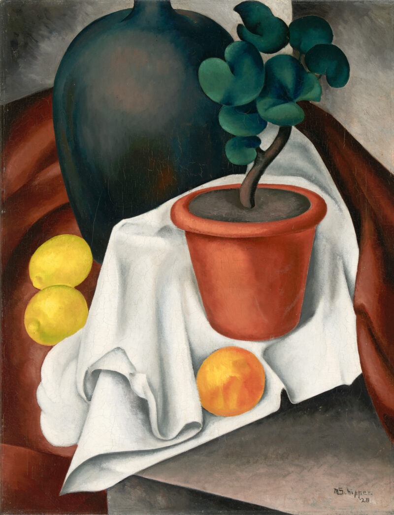 Stilleben mit Topfpflanze und Zitrusfrüchten. Öl auf Leinwand. 1928. 65,5 x 50 cm. Gerahmt.