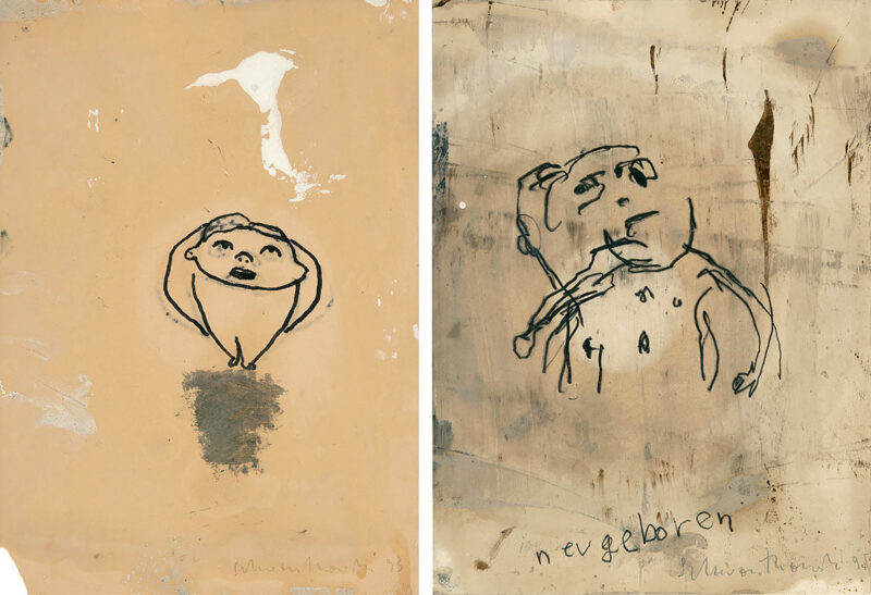 Kleiner Mann - neugeboren. Zwei Blatt. Mischtechnik auf bräunlichem Papier bzw. Papier. 1993/95. 29,8 x 21 bzw. 30 x 22 cm. Jeweils unter Glas gerahmt.