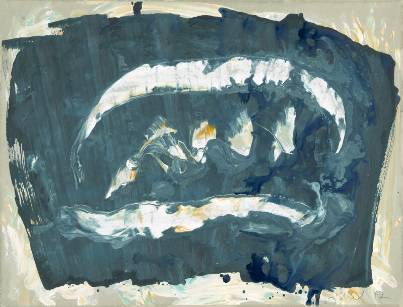 Geringtes mit Gelb. Gouache auf blaugrauem Bütten. 1994. 48,5 x 63,5 cm, unter Passepartout. Unter Glas gerahmt.
