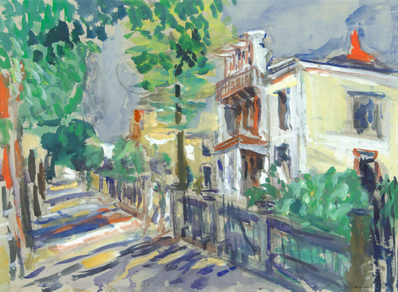 Radebergerstraße (Dresden). Gouache u. schwarze Kreide auf gräulichem festen Papier. 43,7 x 59,4 cm, unter Passepartout. Unter Glas gerahmt.