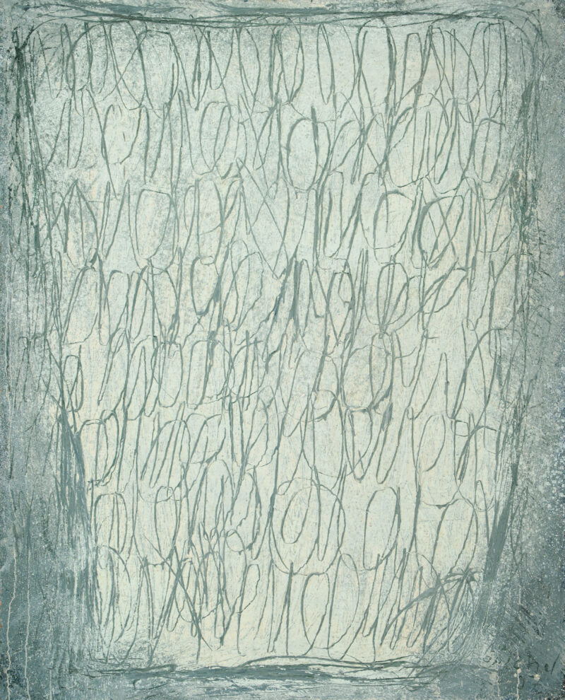o.T. (Blaue Strukturen). Öl auf Leinwand. 1991. 181 x 216 cm. In Aluminiumleiste gerahmt.