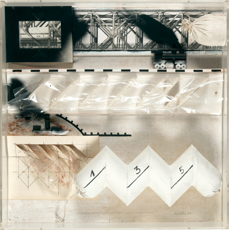 Herta Suite: Emscher-Wurst-Wasser-Luft-Land und Brücken. Assemblage (Sprayfarbe, Acryl, Holz, Bleistiftzeichnung, Fotografie, Folie, Wurstattrappe) in Plexiglaskasten. 1972. 61 x 61 x 10,5 cm.