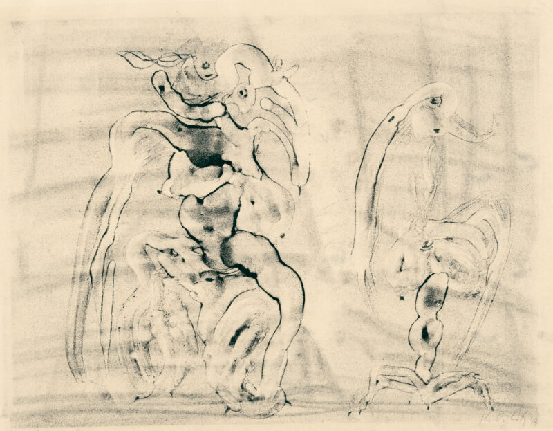 Ungleiches Paar. Monotypie auf feinem chamoisfarbenen Bütten. 1947. 37 x 48,5 (42,4 x 59,8) cm, unter Passepartout.
