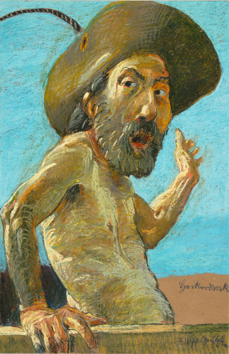 Gröszer/Sperling 100 - Bei dem Dargestellten handelt es sich vermutlich um den Kurator und Autor Christoph Tannert. - "Die ganze Palette gesellschaftlichen Seins ist authentisch, visuelle Sensation permanent - Glimmer, Glanz und Trivialität allgegenwärtig. Daran entzünde ich meine Kunst." (Gröszer, zitiert nach: Kunst in der DDR. Berlin, Neue Nationalgalerie, 2003, S. 306) - Clemens Gröszers extravagante Gestalten und Figuren sind abschreckend und faszinierend zugleich. Detailliert bis in die letzte Faser beschreibt er die Körper seiner Protagonisten und sucht "bewusst die überzogene Versenkung in einen detailreichen Naturalismus" (Fritz Jacobi, Großstadt veristisch, in: ebd., S. 228).