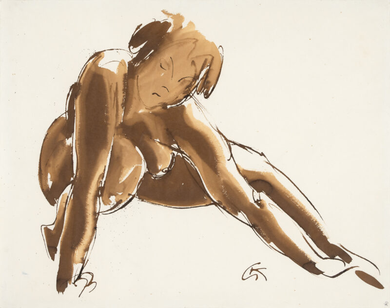 Kauernde (Weiblicher Akt). Pinsel u. Feder in Sepia auf Karton. 36,9 x 46,8 cm, im Passepartout freigestellt. Unter Glas gerahmt.