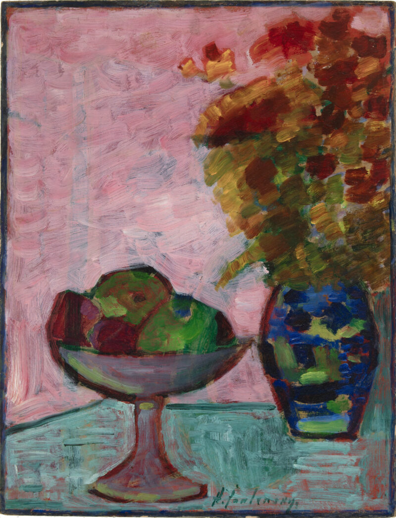 Stilleben mit Fruchtschale und Blumenvase. Öl über Graphit auf Malpappe. Um 1932. 53,9 x 41,5 cm. Gerahmt.