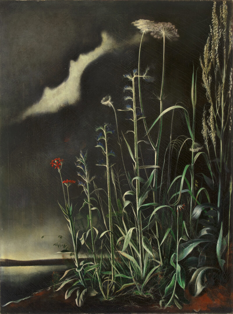 Auf diesem eindringlichen Selbstbildnis begegnet Kontuly dem Betrachter mit konzentriertem, nahezu prüfendem Blick. In frontal angelegter Halbfigur inszeniert der Künstler sich in formalem Anzug und Fliege - ein Selbstentwurf, der künstlerische Professionalität und bürgerliche Selbstbehauptung gleichermaßen betont. Besonders prägnant ist die kompositorische Zweiteilung: Links öffnet sich das Bild wie durch ein Fenster in eine helle, weit ausgreifende Landschaft mit wolkenbewegtem Himmel, während rechts eine dunkle, nahezu monochrome Fläche das Gesicht in dramatischer Licht-Schatten-Wirkung modelliert. Diese Gegenüberstellung - Naturraum und Innenraum, Offenheit und Verdichtung - hat symbolischen Charakter. Sie kann als bildnerische Reflexion über die Rolle des Künstlers gelesen werden: zwischen Weltbeobachtung und innerer Sammlung, zwischen Außenwirklichkeit und subjektiver Wahrnehmung. Die Malweise verbindet neusachliche Partien mit weicheren Übergängen. Kontuly gestaltet das Gesicht mit präziser Zeichnung und fein abgestuften Tonwerten, wodurch ein fast skulpturaler Eindruck entsteht. Gleichzeitig setzen die Landschaftspartie und die Wolkenformationen einen malerischeren, atmosphärischen Akzent. Die Farbigkeit bleibt insgesamt gedämpft, wobei der starke Hell-Dunkel-Kontrast den Ausdruck intensiviert und dem Werk eine psychologische Spannung verleiht. - Kontuly hatte an der Akademie der Bildenden Künste in Prag und der Hochschule für Bildende Künste in Budapest unter István Réti und Andor Dudits studiert. Bereits während seines Studiums konnte er im Museum der Ostslowakei in Kosice ausstellen und erhielt 1928 den Benczúr-Preis, eine Anerkennung des Talents des Malers, der später zahlreiche weitere renommierte Preise gewinnen sollte, darunter den Klebelsberg-Preis und die Wiener Goldmedaille. In den 1930er Jahren stellte er seine Werke im Ernst Museum in Budapest aus und trat der Künstlergilde Munkácsy bei. Die neue Sachlichkeit des italienischen Novecento gab Kontulys Malstil neue Impulse, als er von 1928 bis 1930 gemeinsam mit seiner Frau Hajnalka Fuchs Stipendiat der Ungarischen Akademie in Rom war. Neben der Ausmalung zahlreicher Kirchen und Sakralbauten, trat er insbesondere durch seine klaren und realistischen Porträts hervor. 2004 widmete ihm die Kunsthalle in Budapest eine Retrospektive zum 100. Geburtstag. - Retuschen.